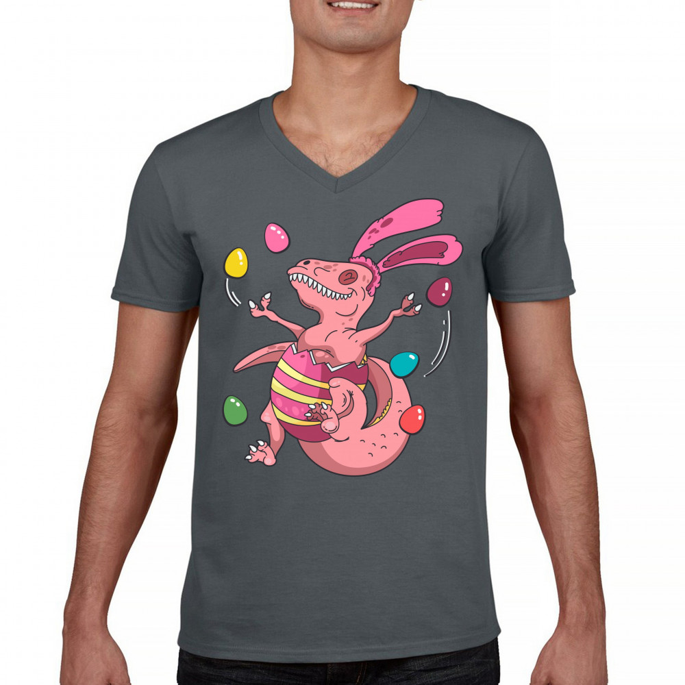 EASTER EGG T-REX v-neck t-shirt happy easter bunny dinosaur egg hunt tee charcoal