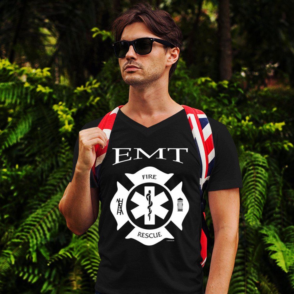 EMT FIRE AND RESCUE v-neck t-shirt emergency first responder ems medic tee black