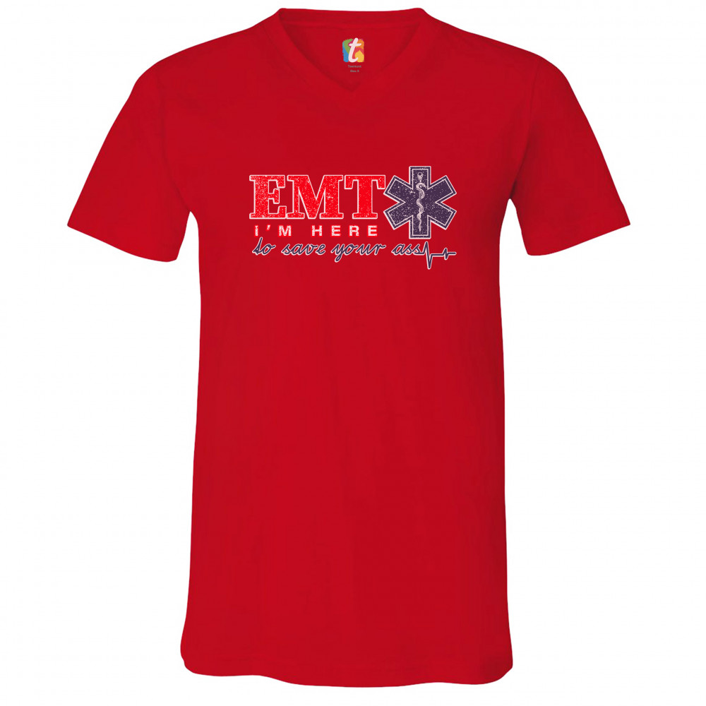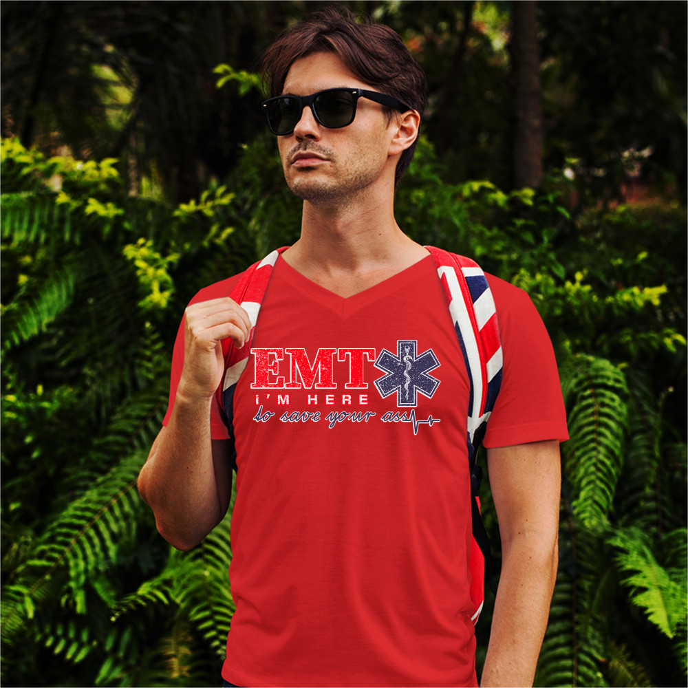 A funny print saying "EMT I'm Here to Save Your Ass". To the right of "EMT" there is the Star of Life, the worldwide recognized symbol of emergency medical services, with the Rod of Asclepius inside of it. A great choice as a gift for a first responder.