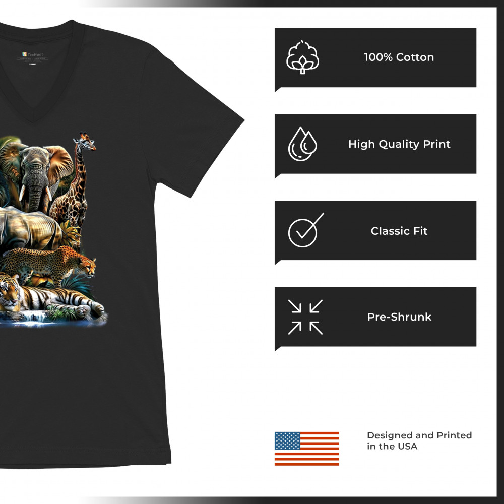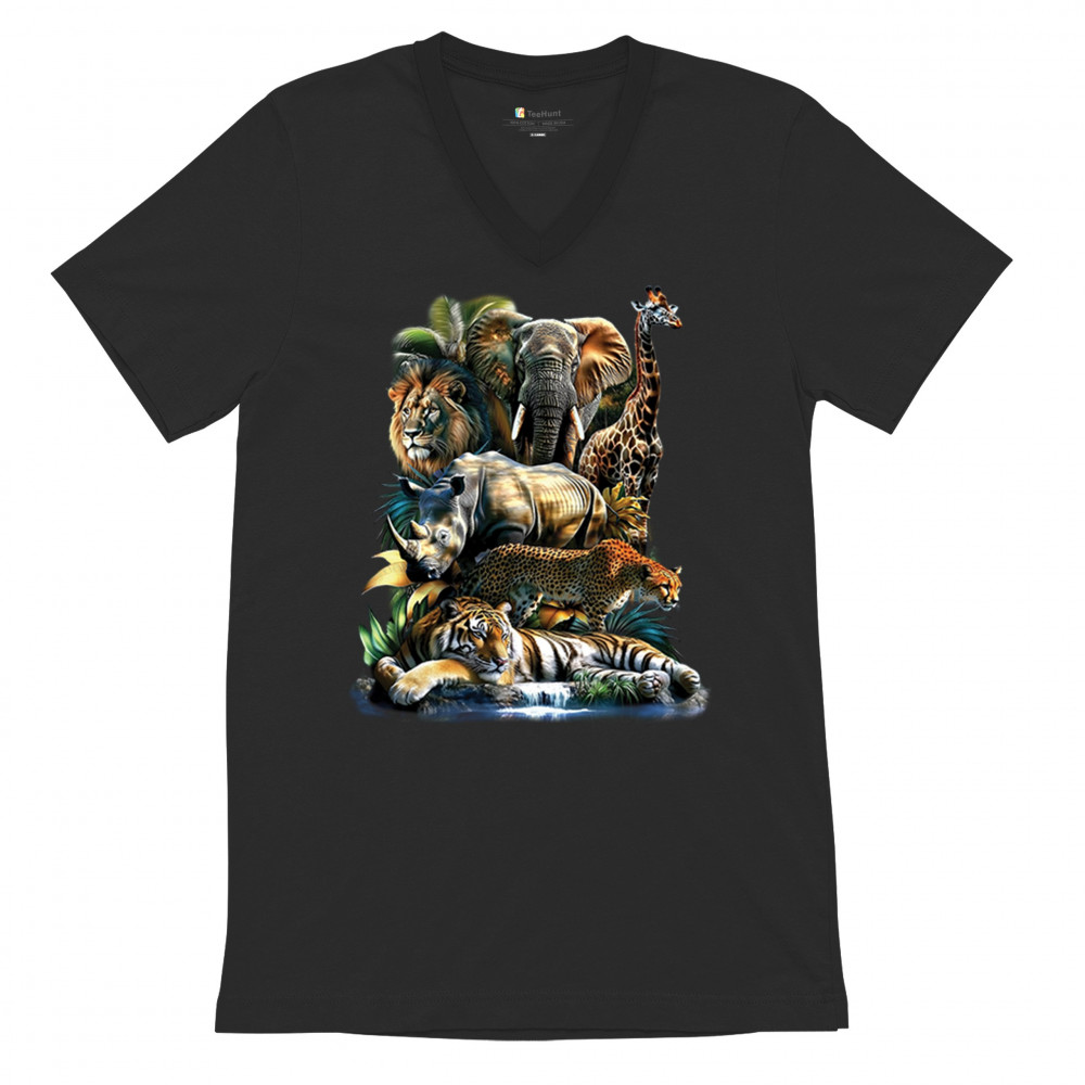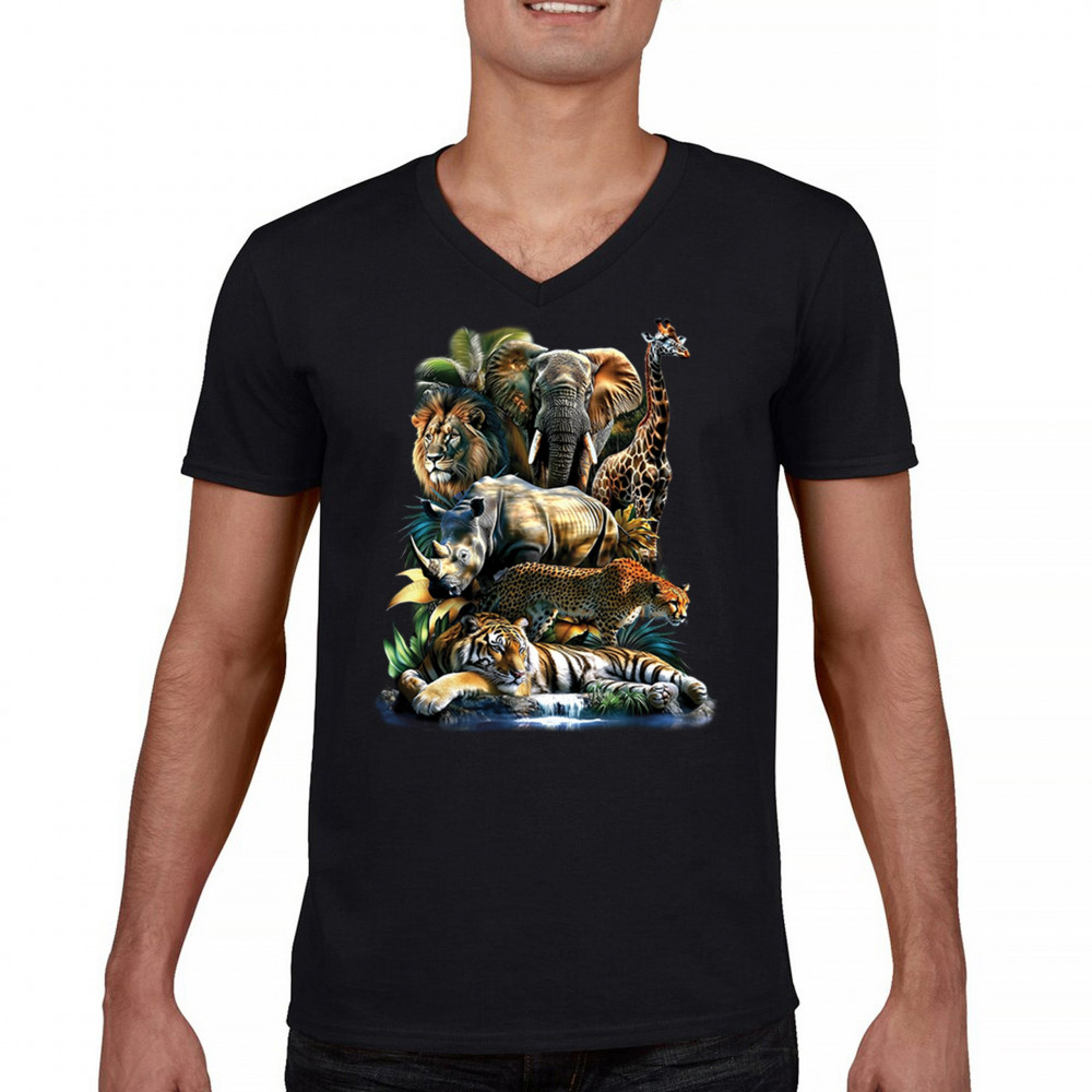 EXOTIC COLLAGE v-neck t-shirt jungle safari animal wild nature lion tiger tee black