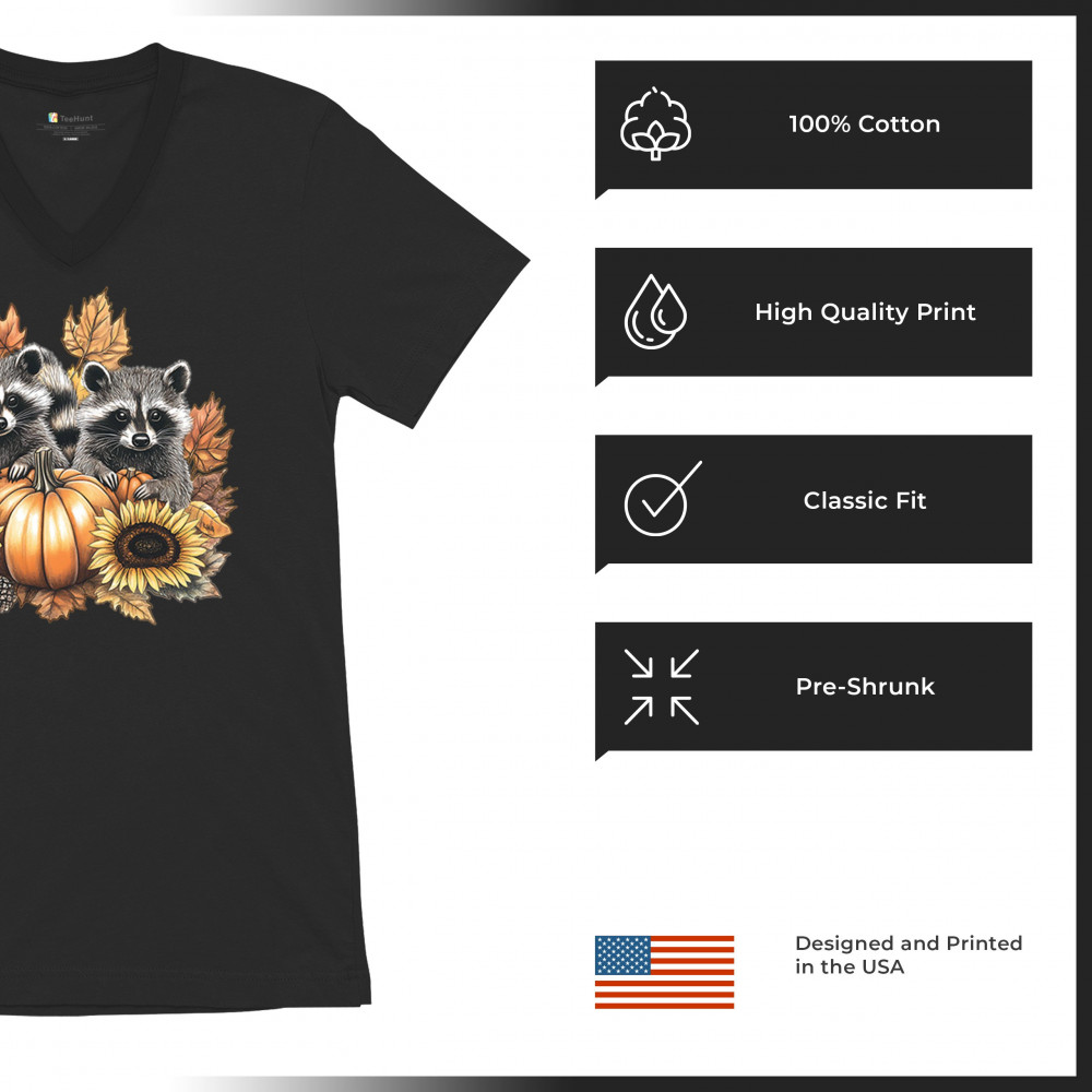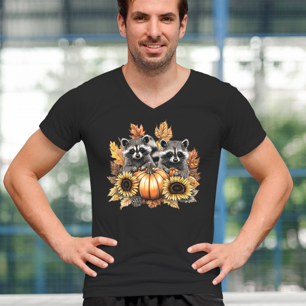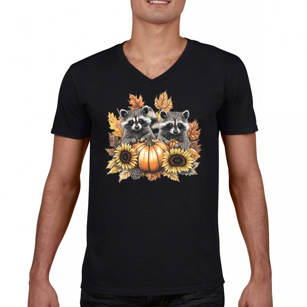 FALL RACCOONS men's v-neck t-shirt thanksgiving day sunflower pumpkin patch black