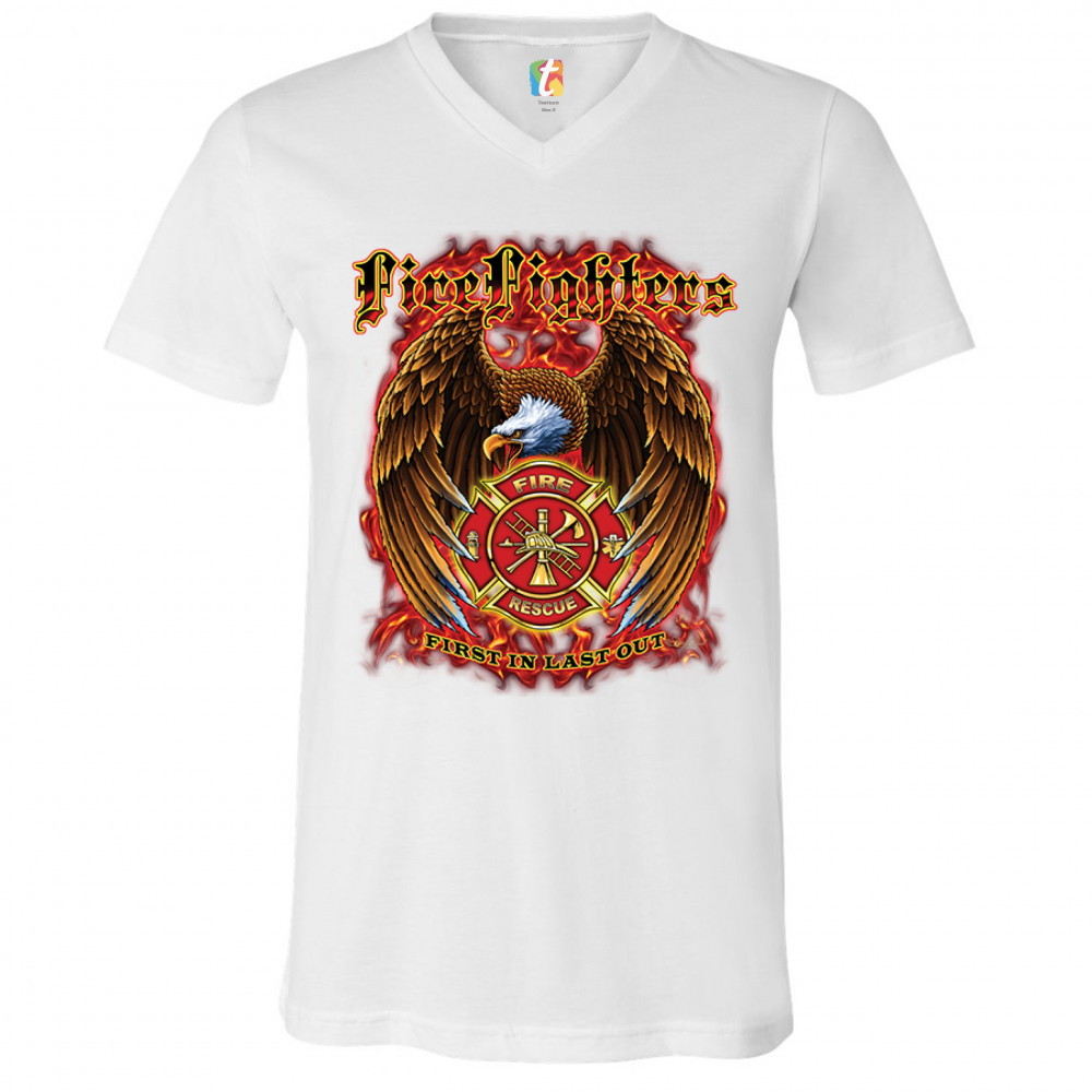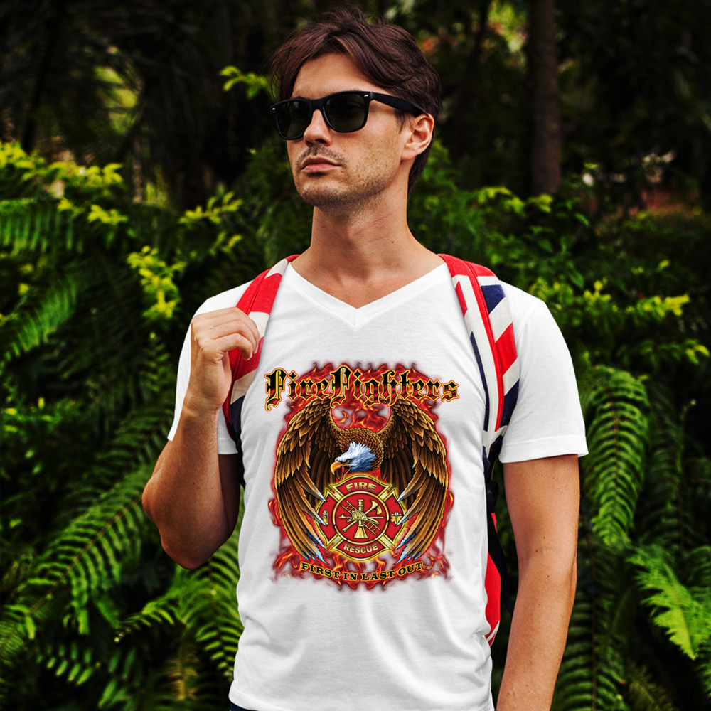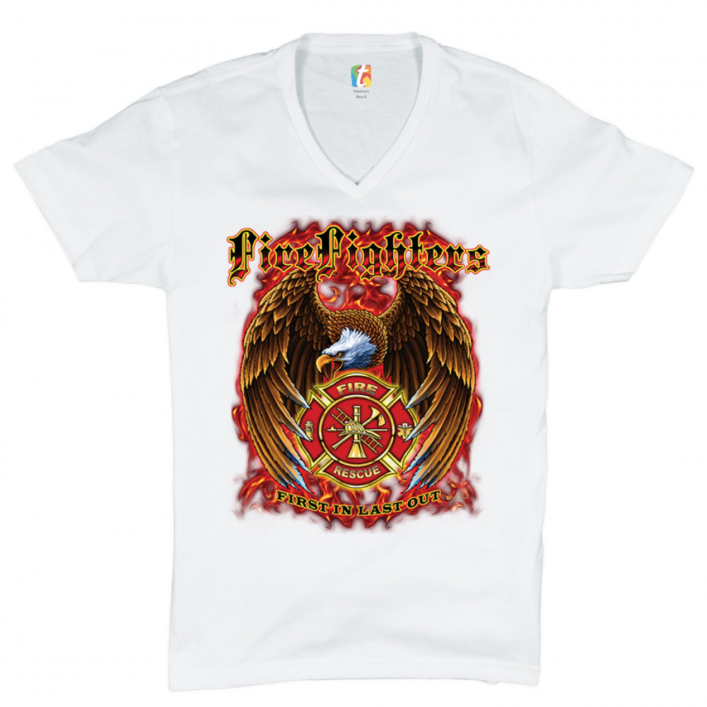 FIREFIGHTERS FIRST IN LAST OUT v-neck t-shirt fire and rescue bald eagle tee white