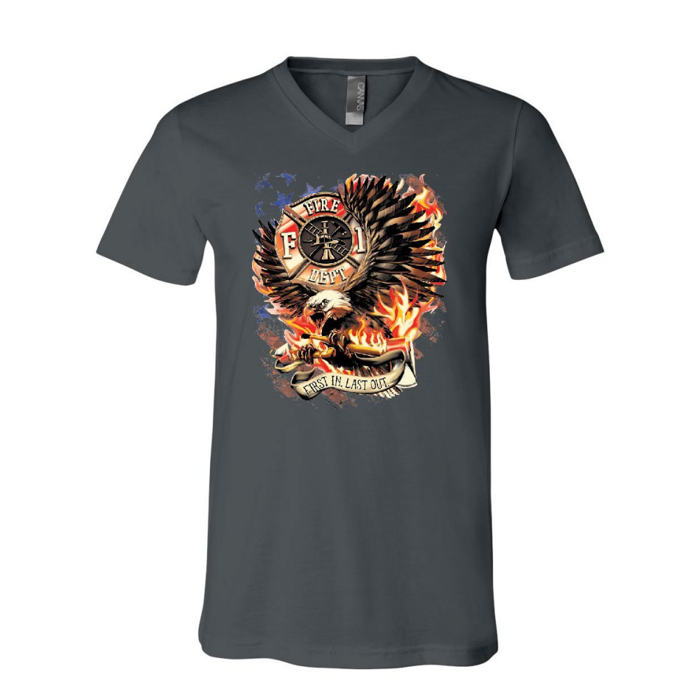 FIREFIGHTER FIRST IN LAST OUT first in last out v-neck t-shirt fire & rescue fd american firefighter tee charcoal