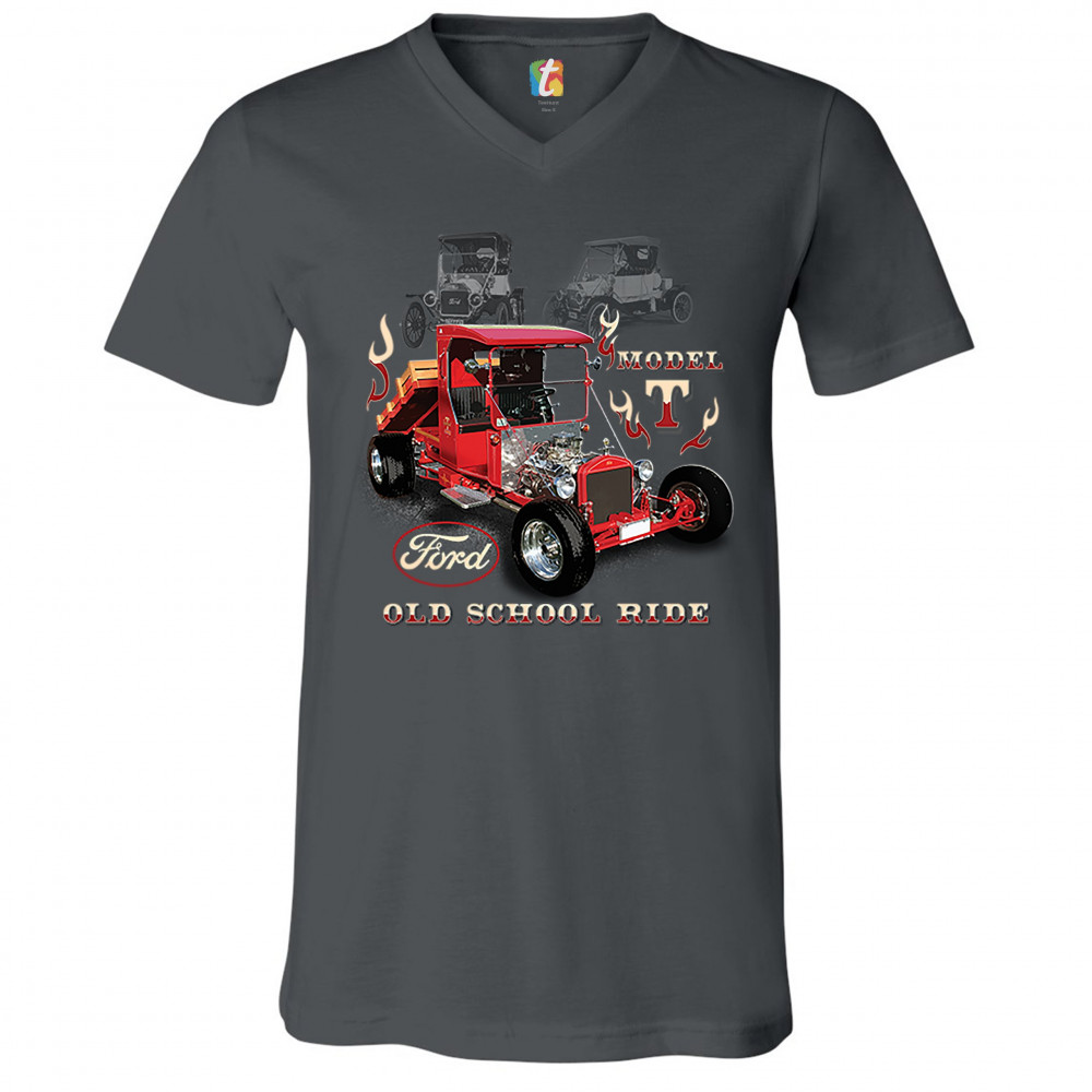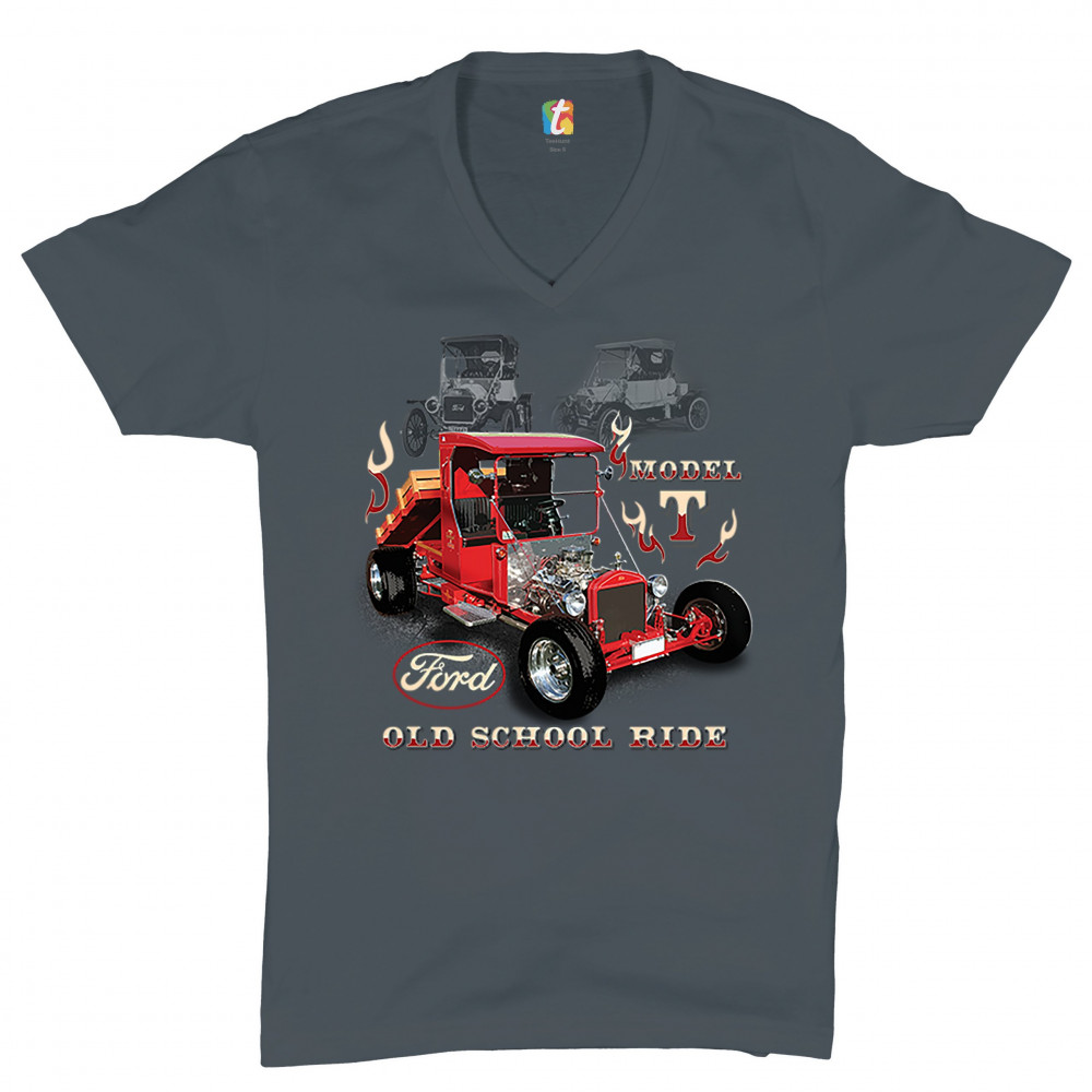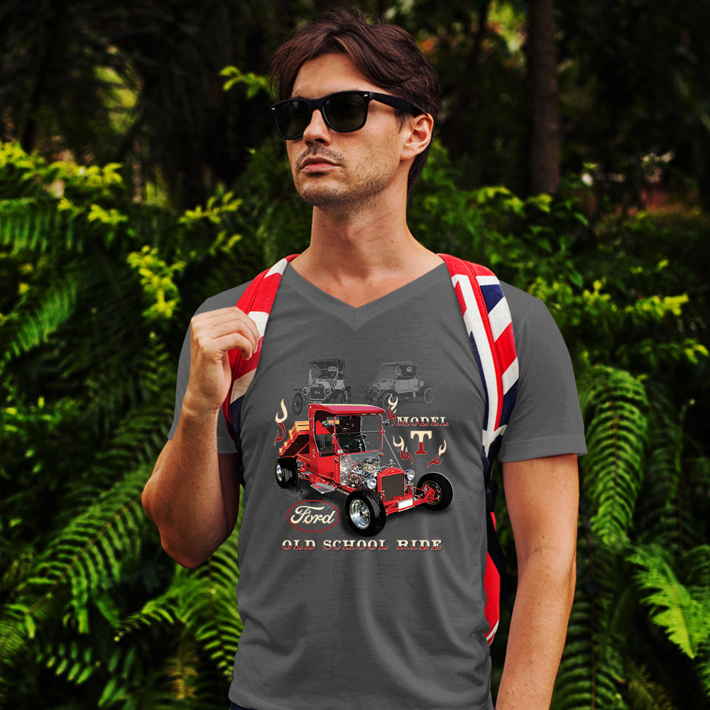 A print featuring a Ford Model T modified as a hot rod. The are also two transparent pictures of original T Models in the background. The print features the Ford logo and says: "Model T, Old School Ride". A great choice for anyone who is a fan of old sch