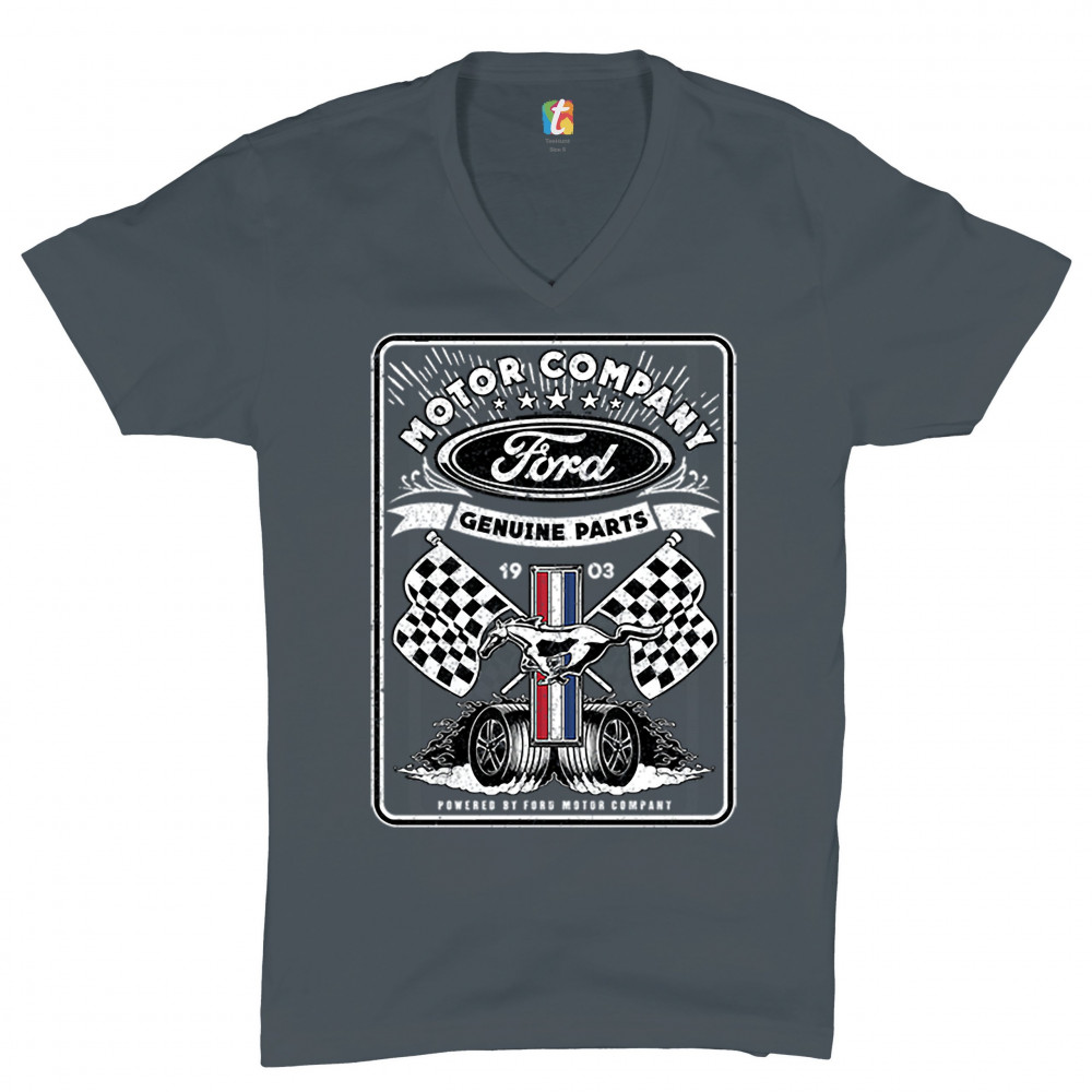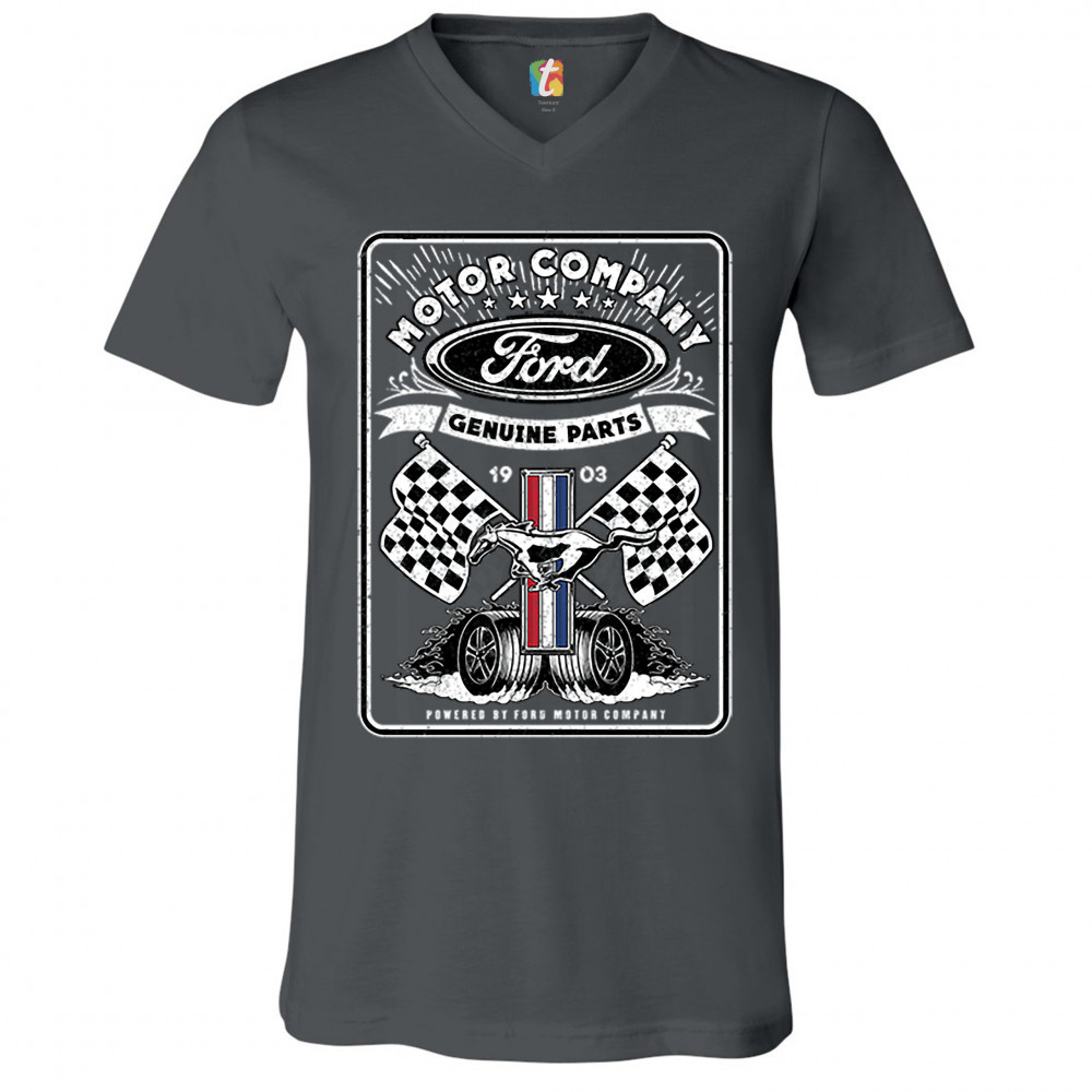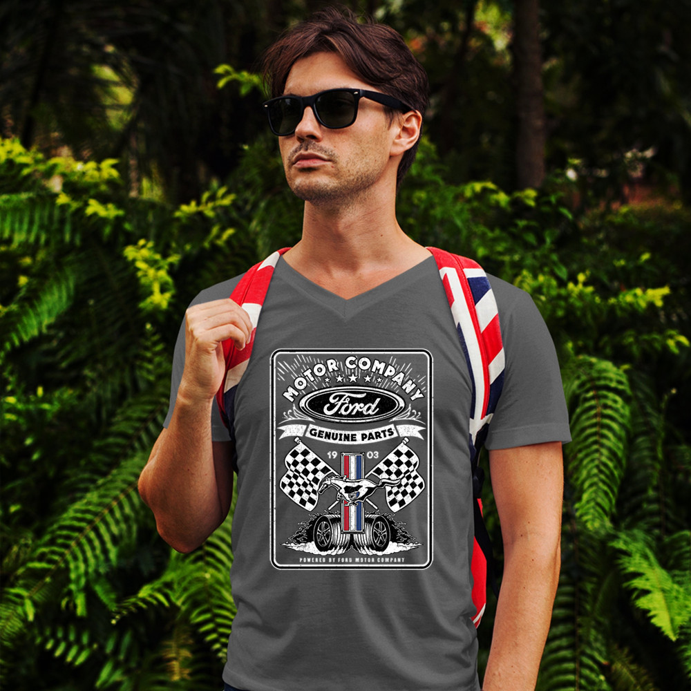 A print featuring Ford logo in the top, Mustang logo in the center, two racing flags and two rolling wheels. The prints says: "Ford Motor Company Genuine Parts 1903" in the top and "Powered by Ford Motor Company" in the bottom. A great choice for anyone w