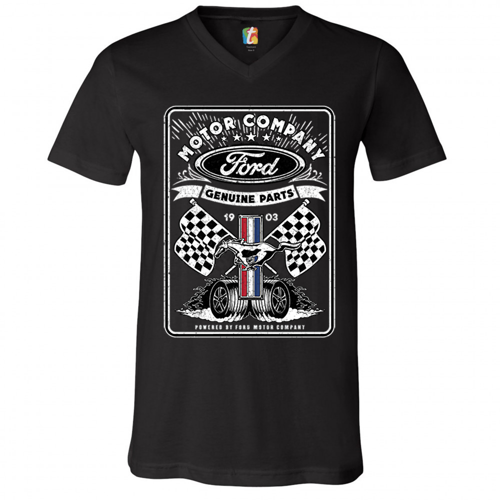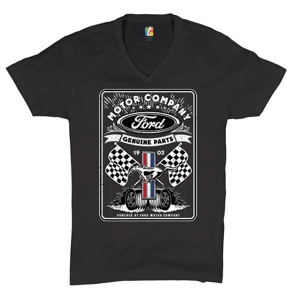 A print featuring Ford logo in the top, Mustang logo in the center, two racing flags and two rolling wheels. The prints says: "Ford Motor Company Genuine Parts 1903" in the top and "Powered by Ford Motor Company" in the bottom. A great choice for anyone w
