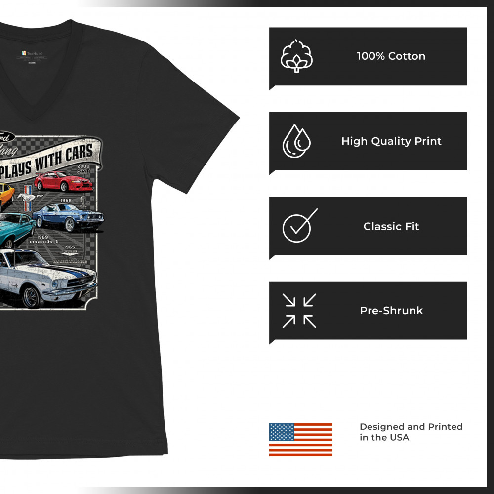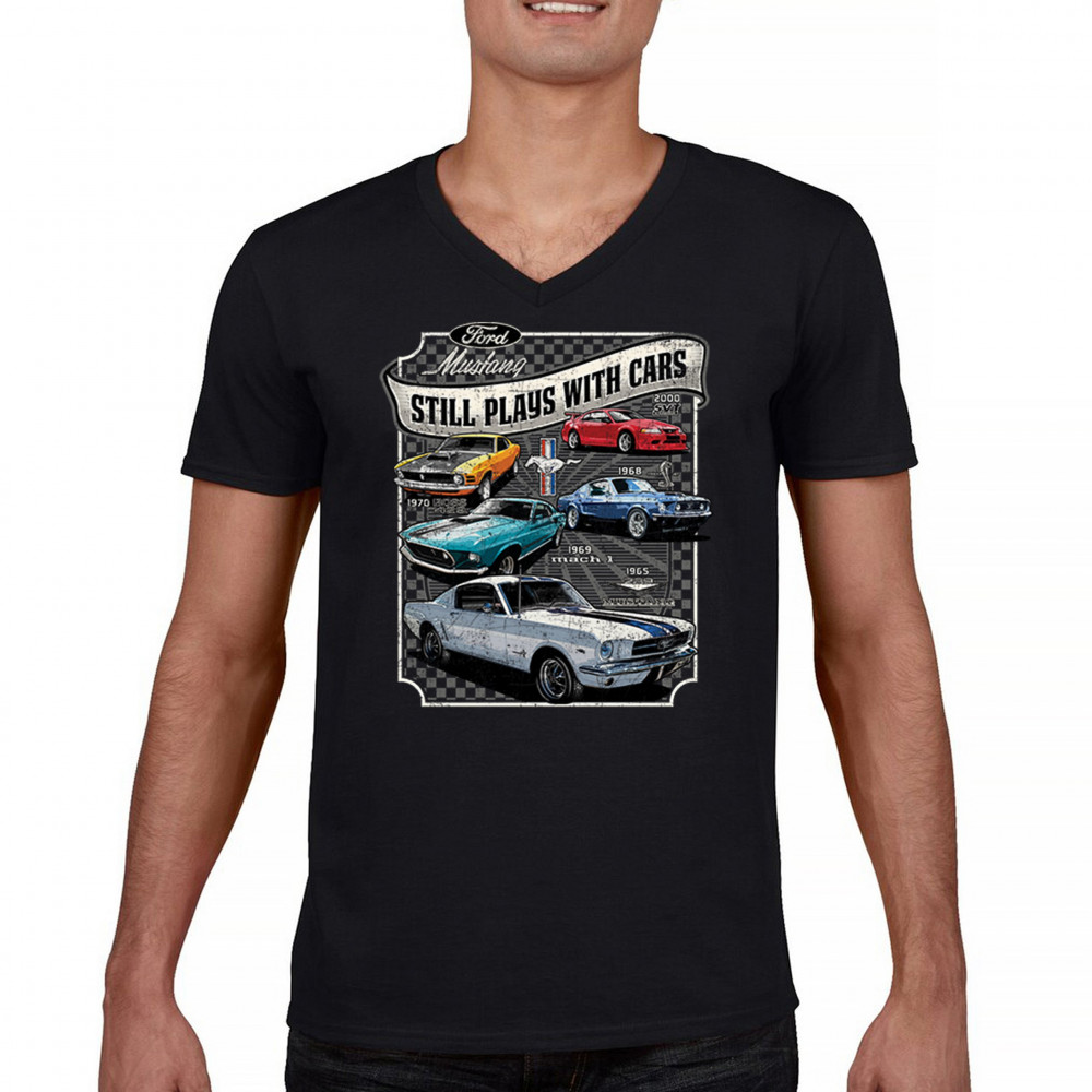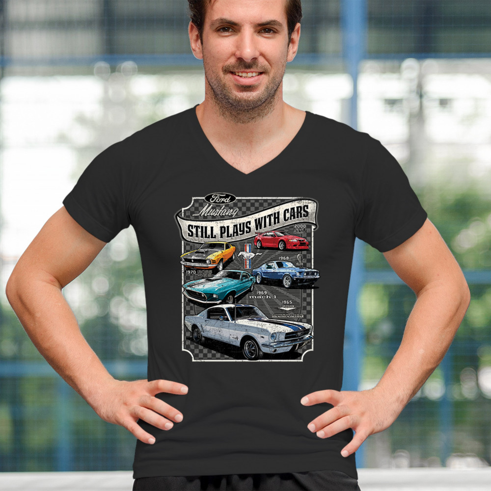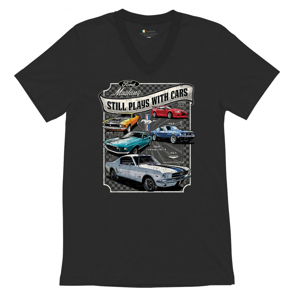 This bold Ford Mustang "Still Plays With Cars" design showcases six classic models from 1965 to 2000, including the 1969 Mach 1, 1970 Boss 302, and 2000 SVT. A dream graphic for muscle car lovers, collectors, and pony car fans. Great for classic auto shows, retro cruises, garage wear, or car clubs.
