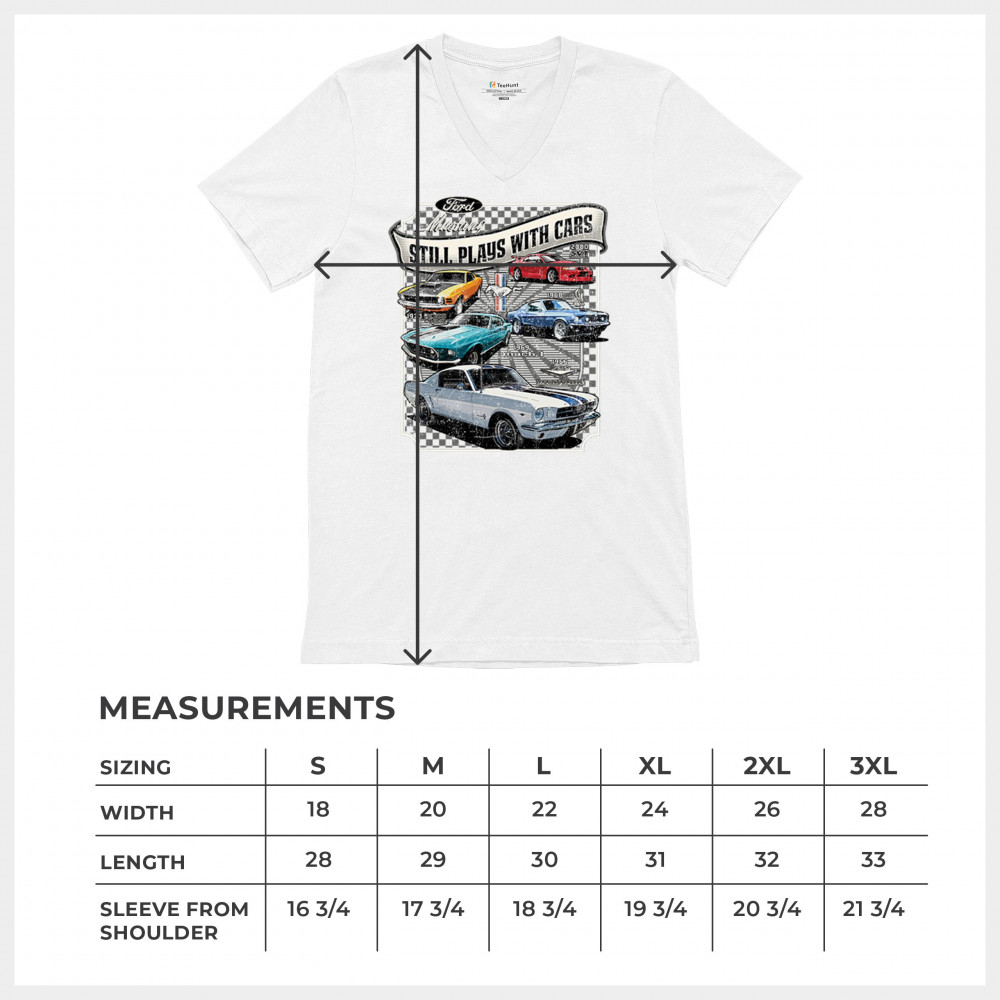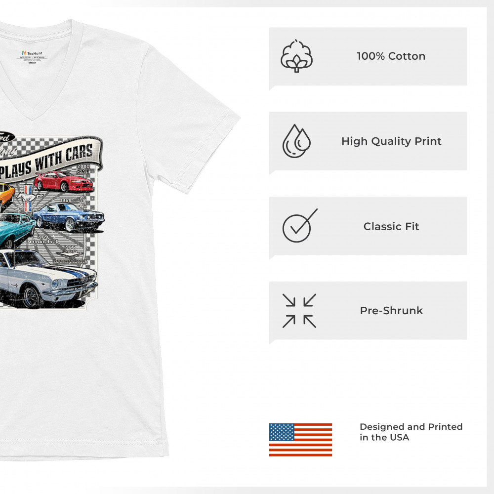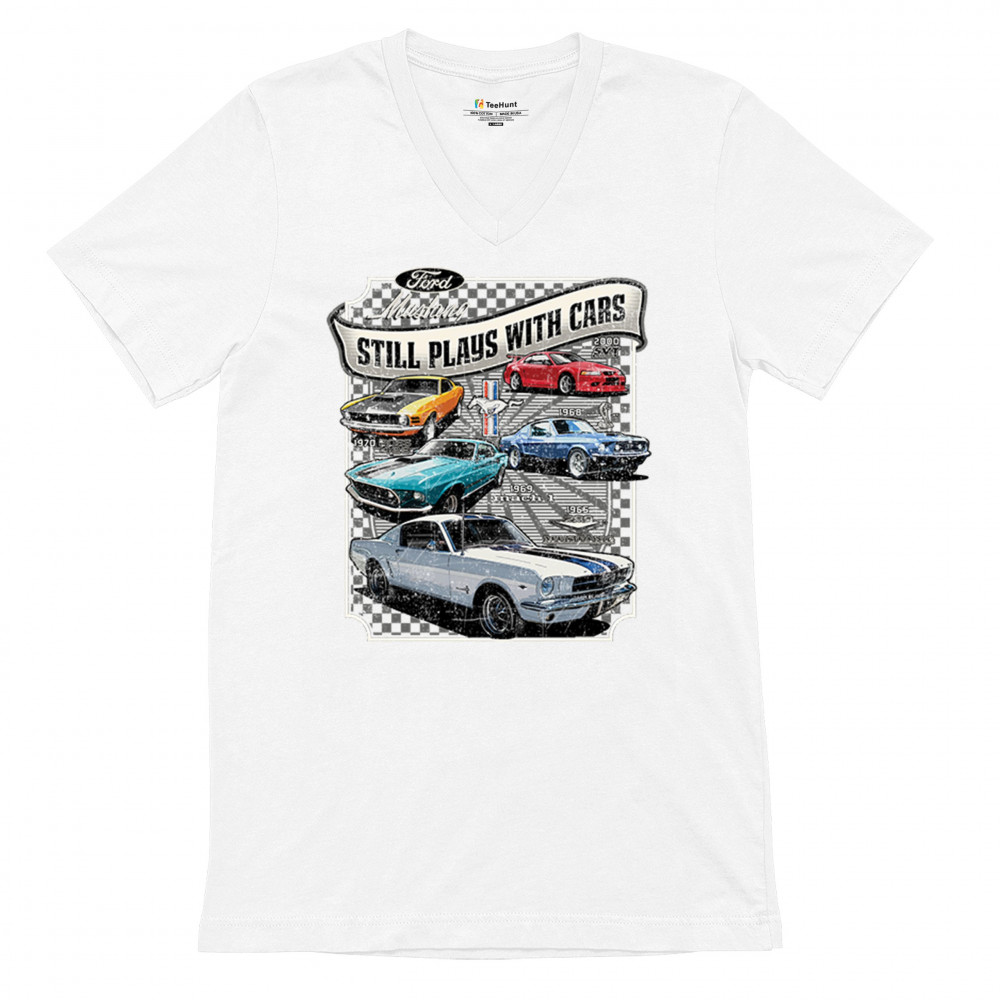 This bold Ford Mustang "Still Plays With Cars" design showcases six classic models from 1965 to 2000, including the 1969 Mach 1, 1970 Boss 302, and 2000 SVT. A dream graphic for muscle car lovers, collectors, and pony car fans. Great for classic auto shows, retro cruises, garage wear, or car clubs.