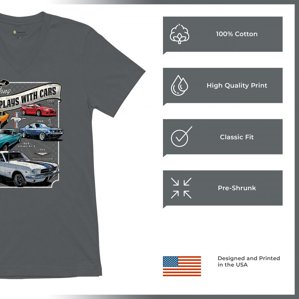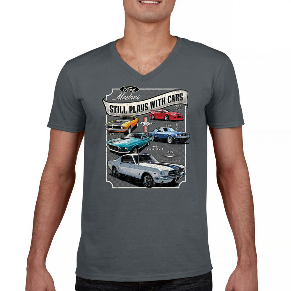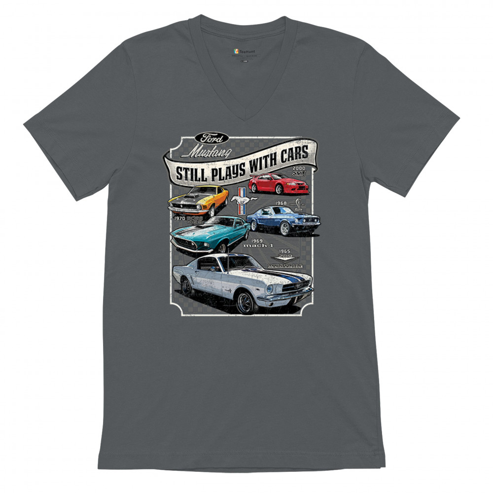 This bold Ford Mustang "Still Plays With Cars" design showcases six classic models from 1965 to 2000, including the 1969 Mach 1, 1970 Boss 302, and 2000 SVT. A dream graphic for muscle car lovers, collectors, and pony car fans. Great for classic auto shows, retro cruises, garage wear, or car clubs.