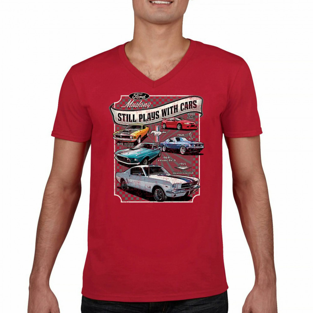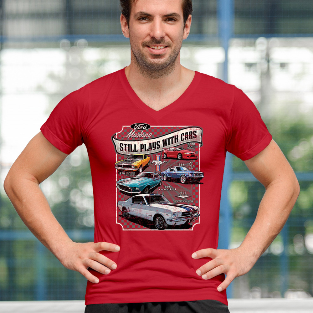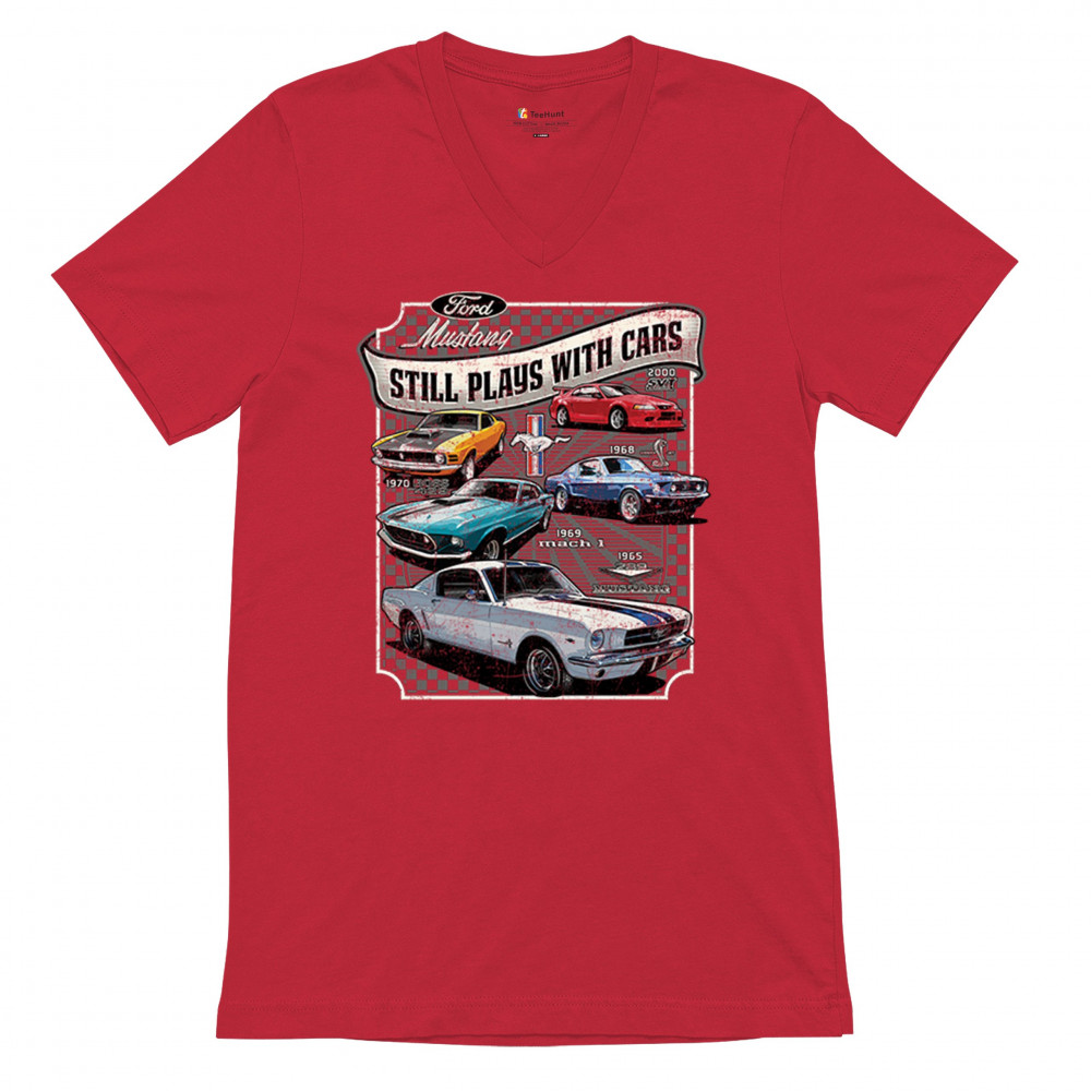 This bold Ford Mustang "Still Plays With Cars" design showcases six classic models from 1965 to 2000, including the 1969 Mach 1, 1970 Boss 302, and 2000 SVT. A dream graphic for muscle car lovers, collectors, and pony car fans. Great for classic auto shows, retro cruises, garage wear, or car clubs.