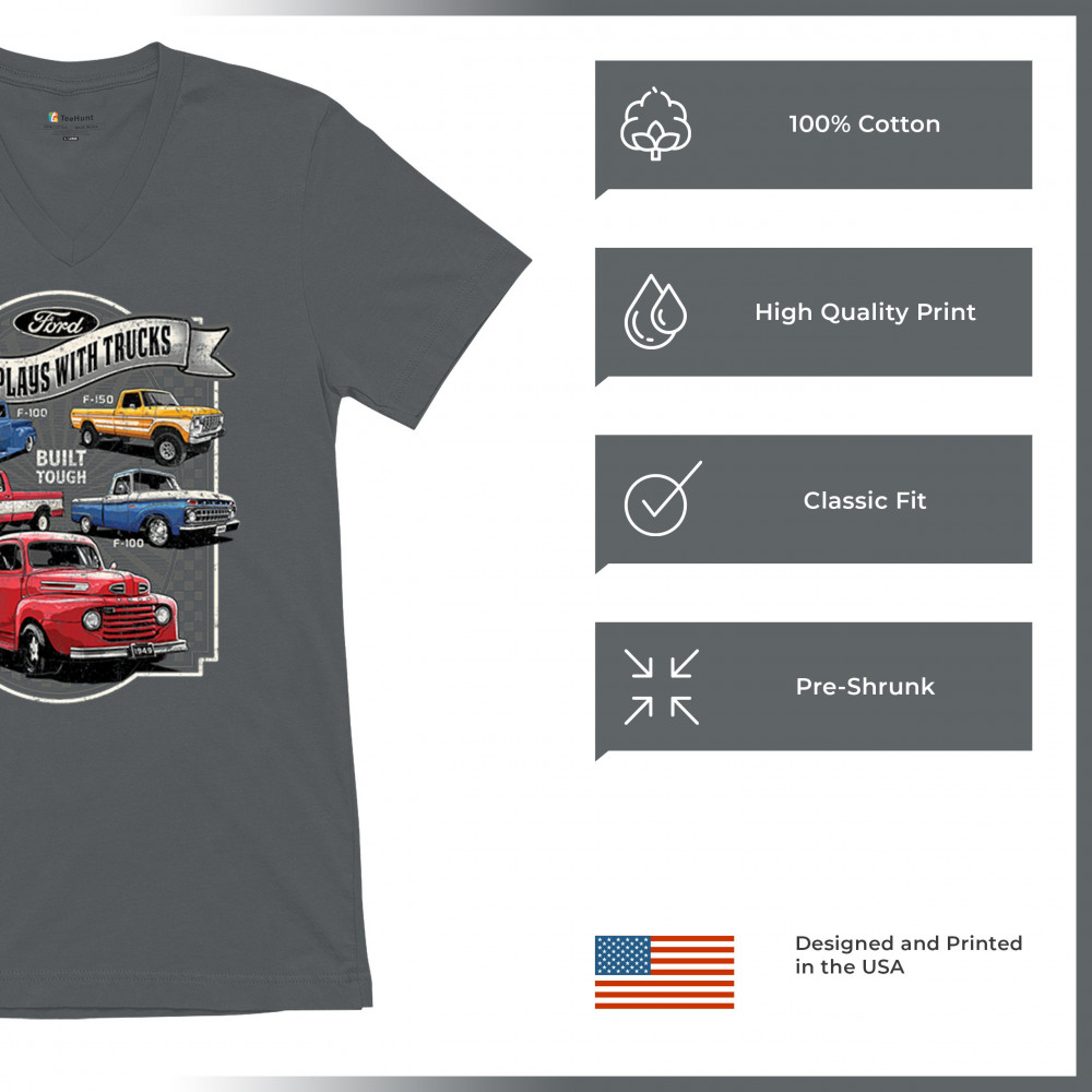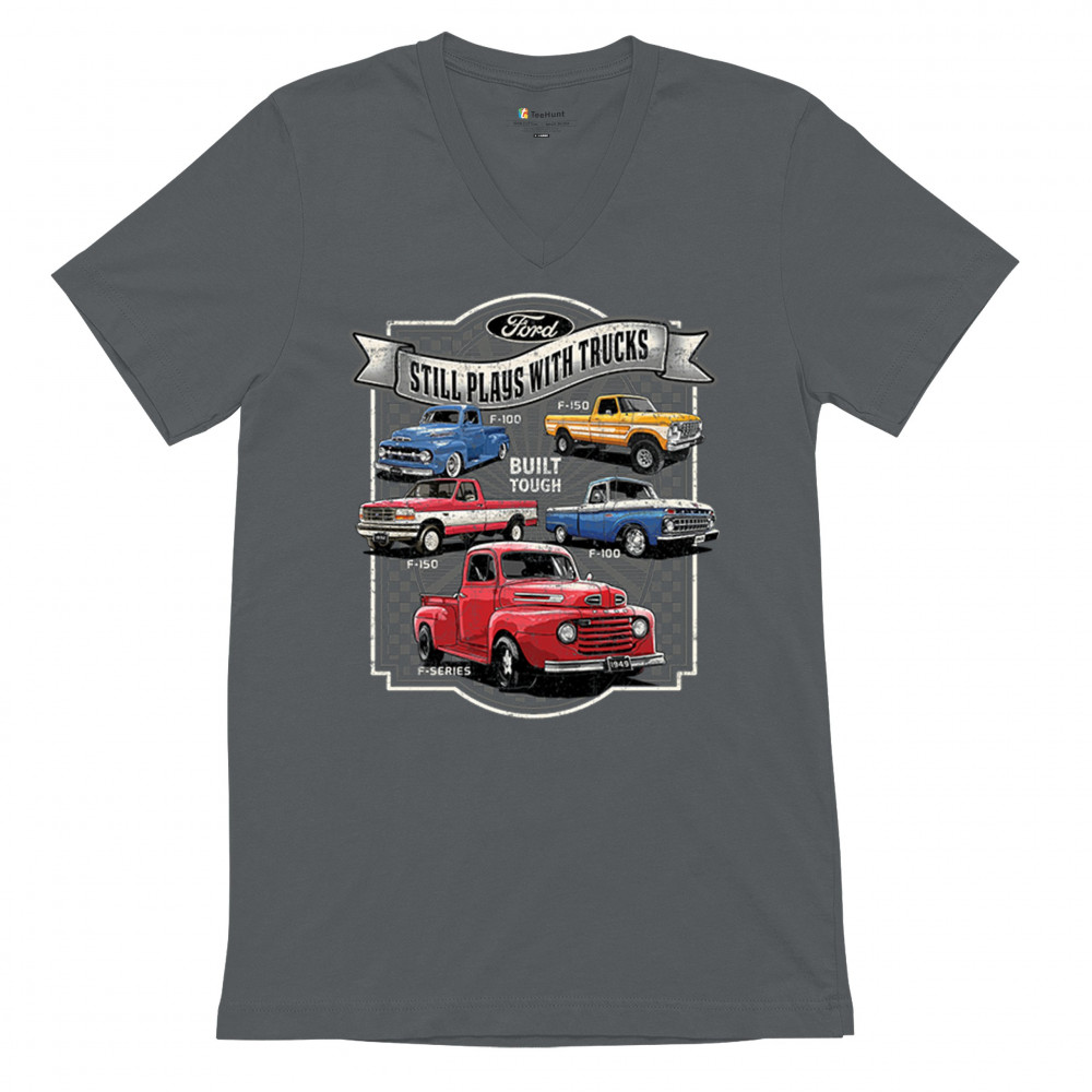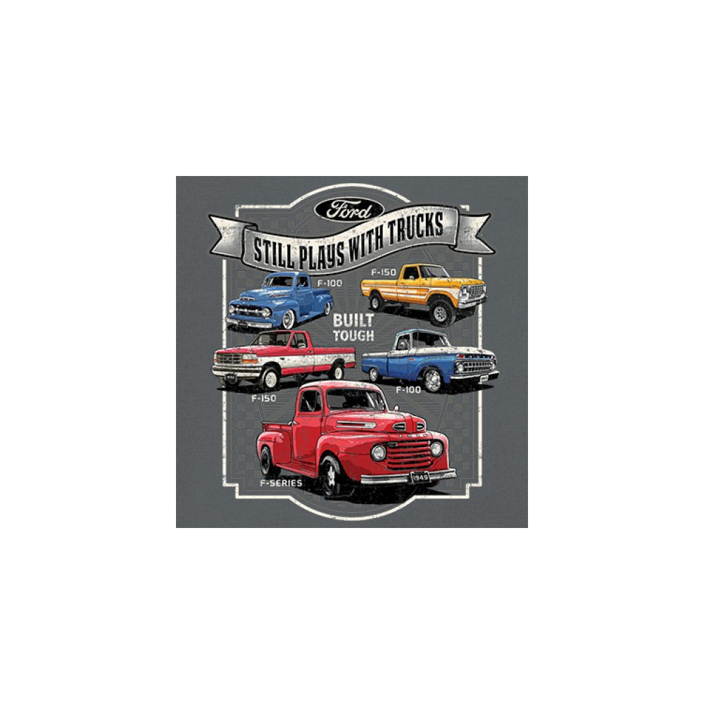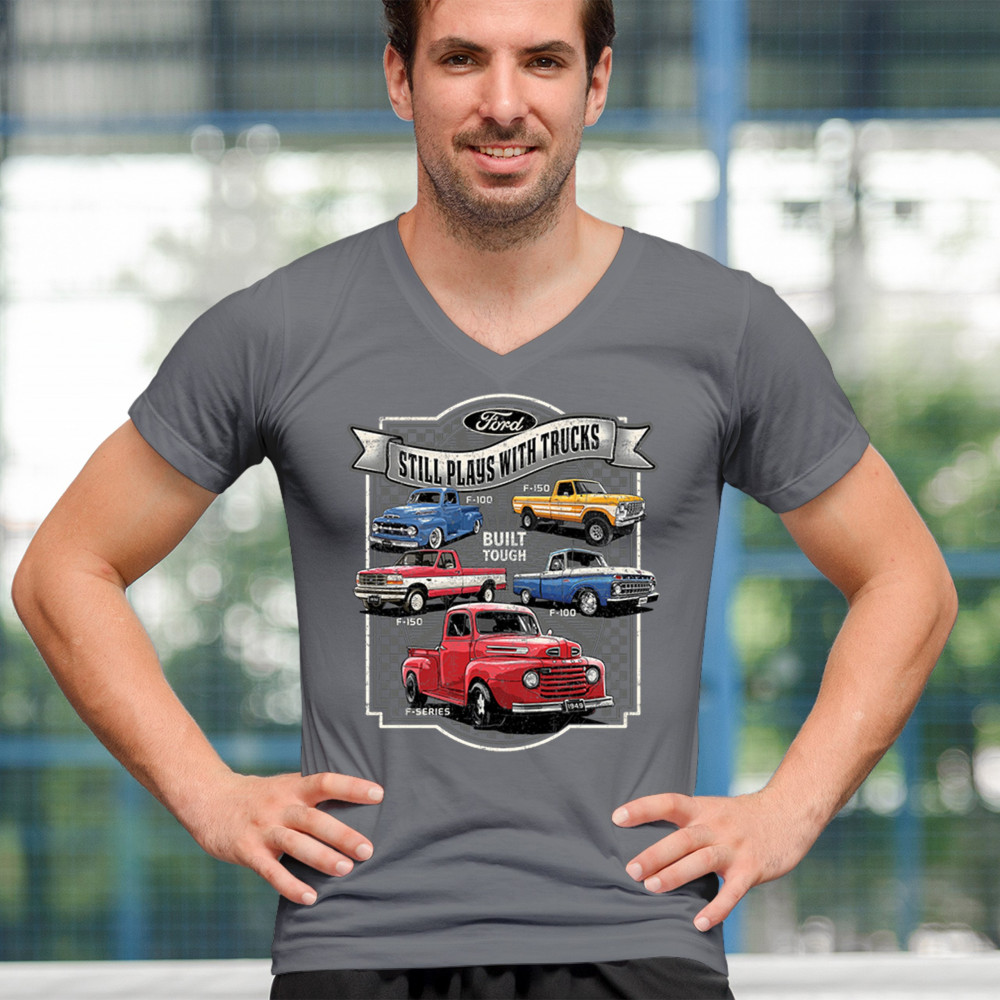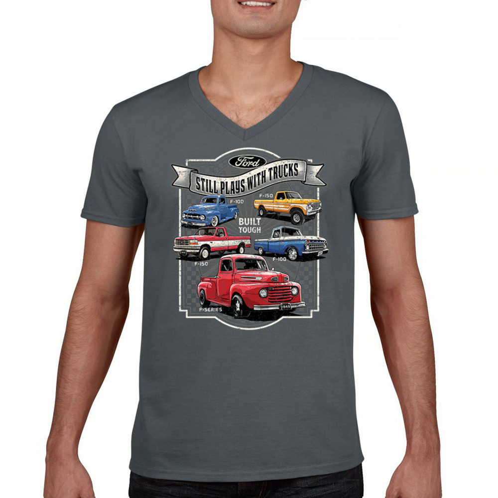Features classic Ford F-Series trucks from 1949 to F-150. Great for vintage truck fans, garage wear, car shows, and collectors who love pickups.