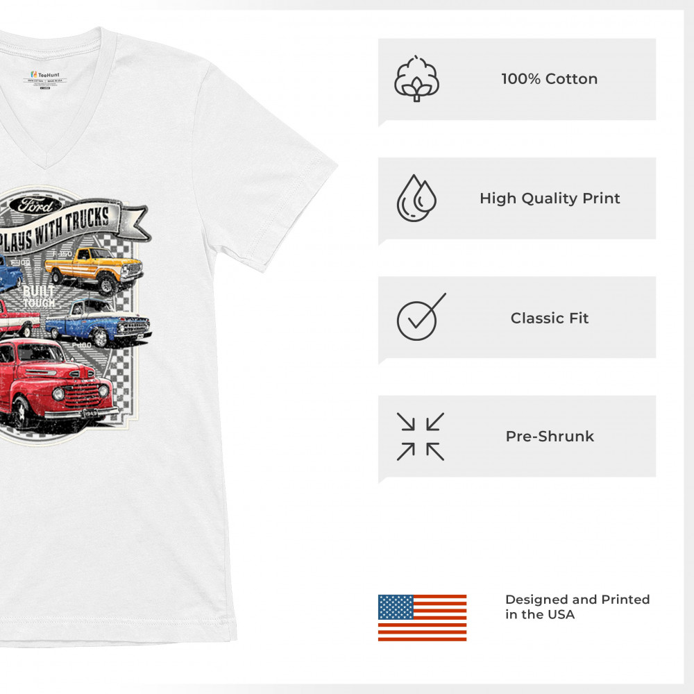 Features classic Ford F-Series trucks from 1949 to F-150. Great for vintage truck fans, garage wear, car shows, and collectors who love pickups.