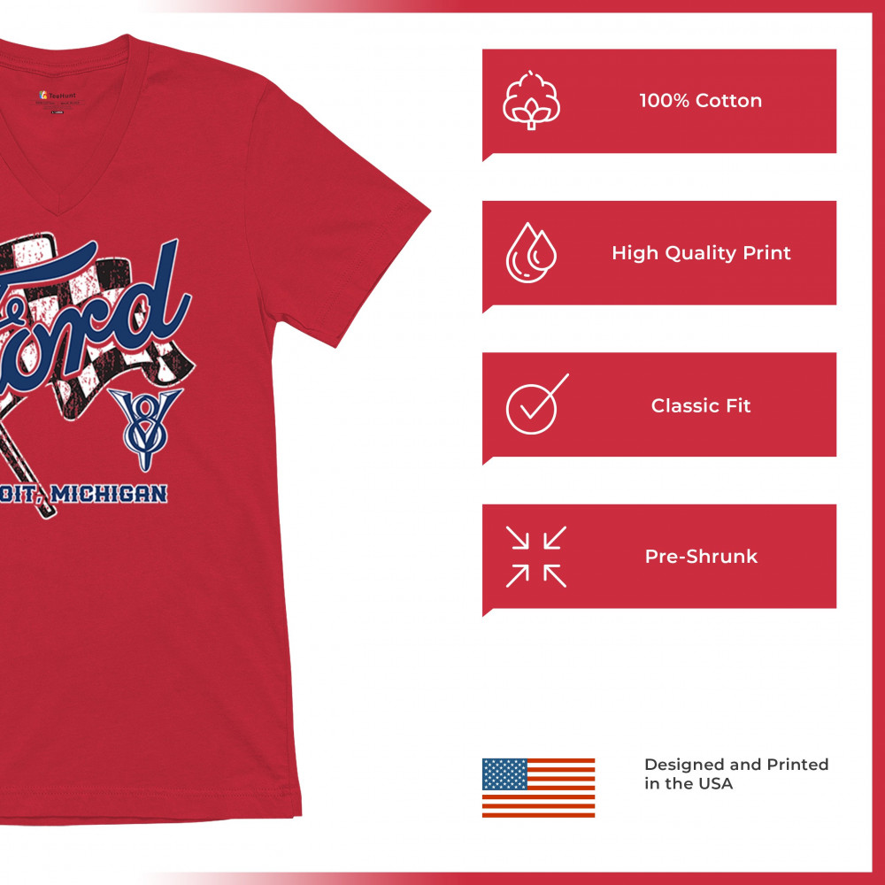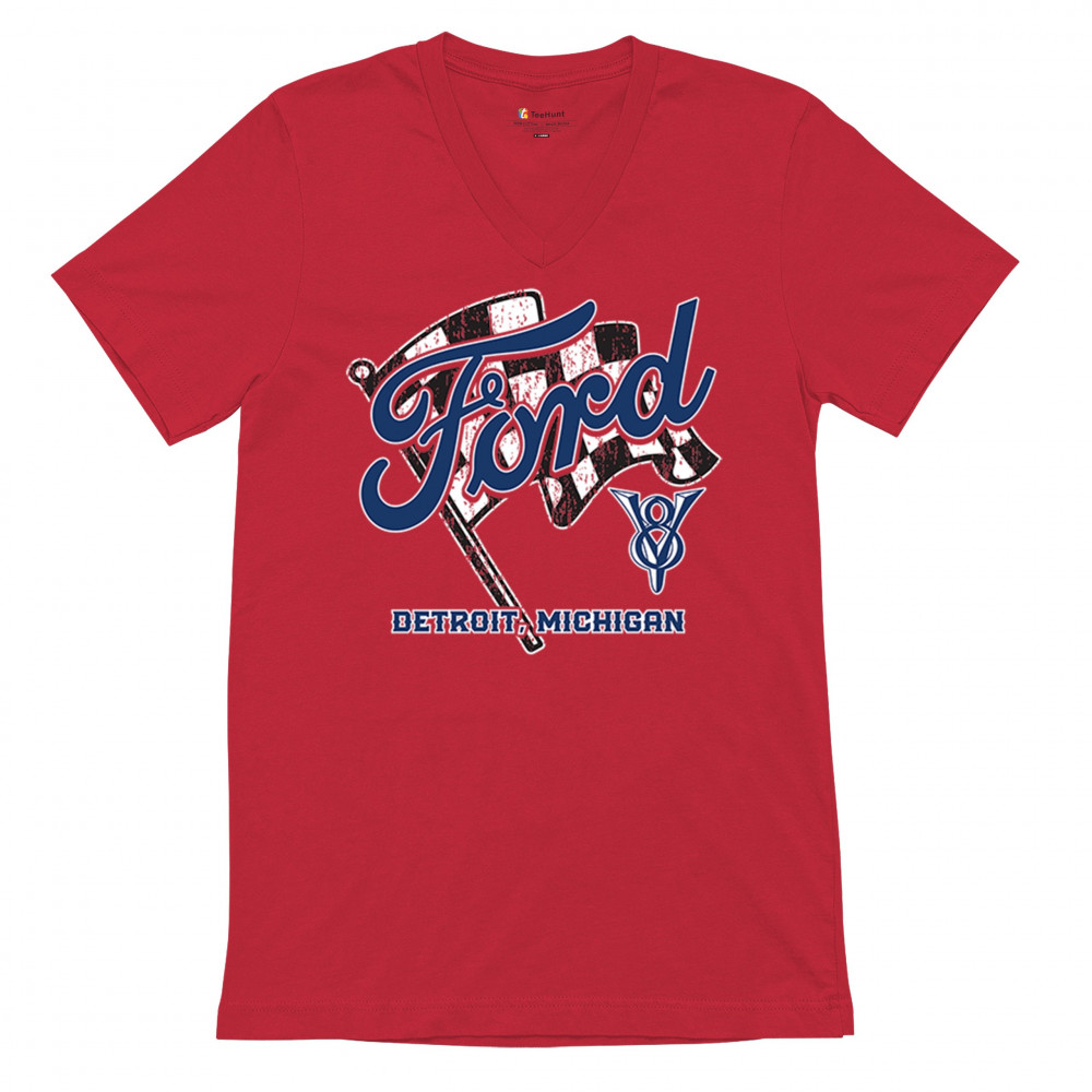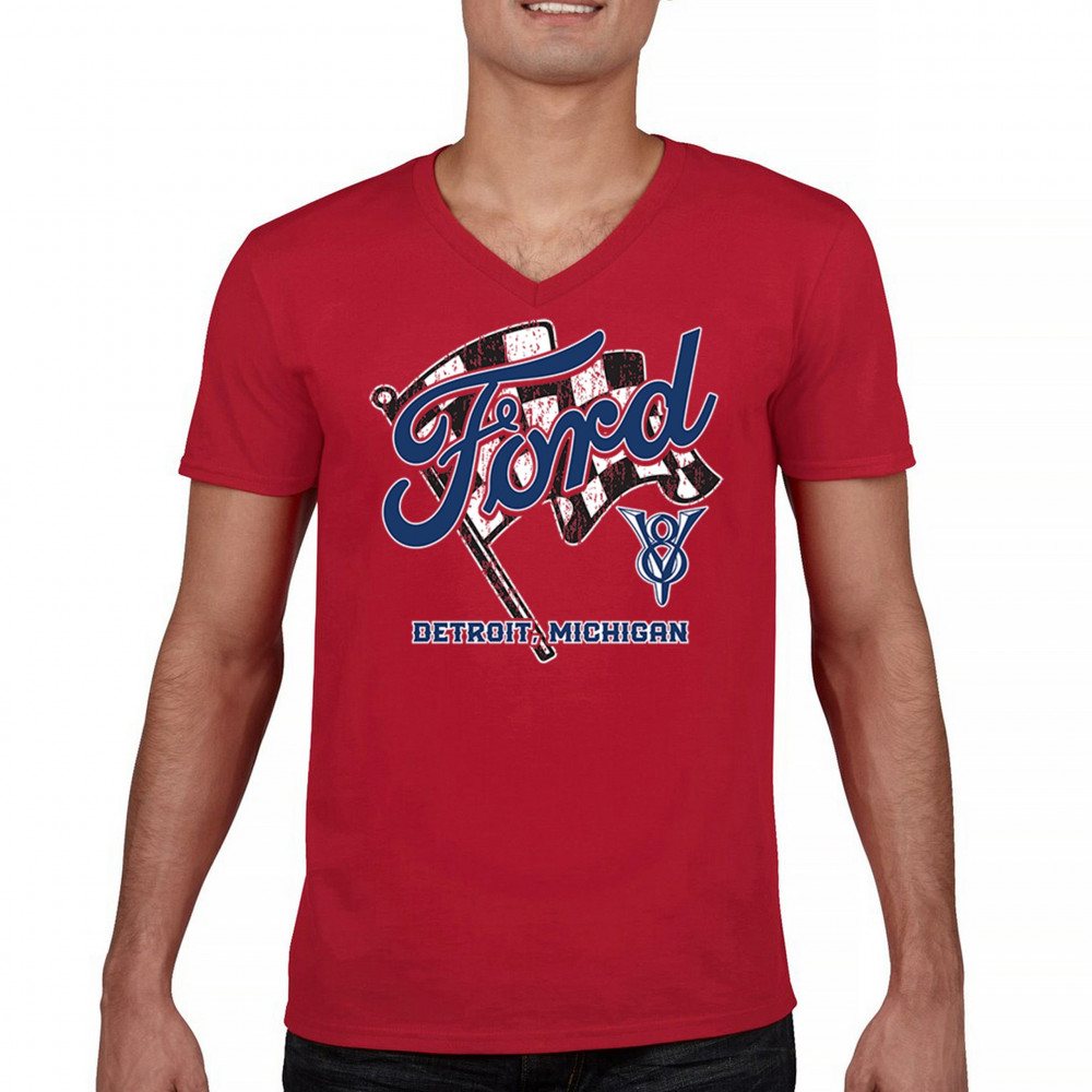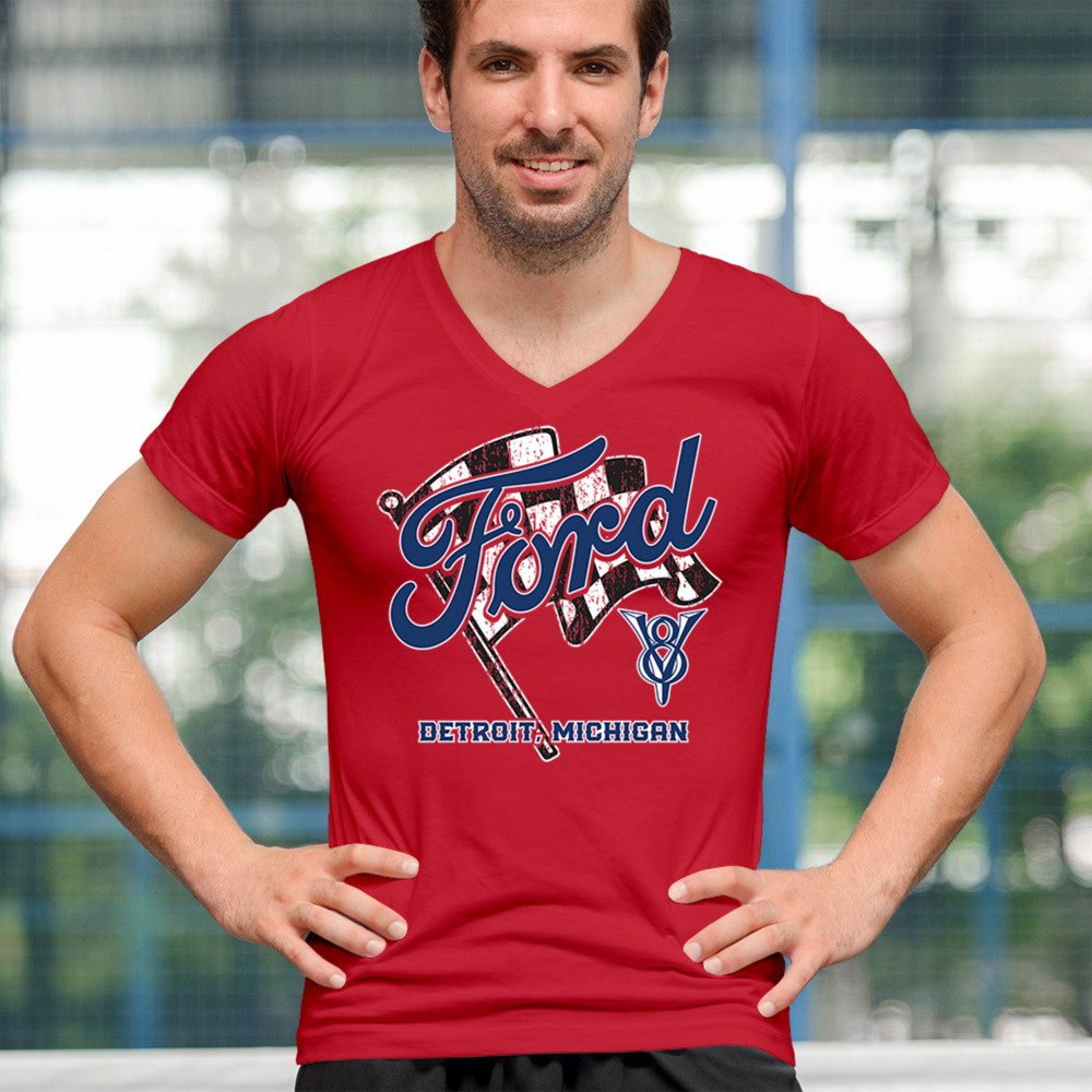 Honor Detroit, Michigan’s Ford legacy with this officially licensed design featuring a checkered flag and bold V8 emblem, perfect for muscle car fans and classic car lovers.