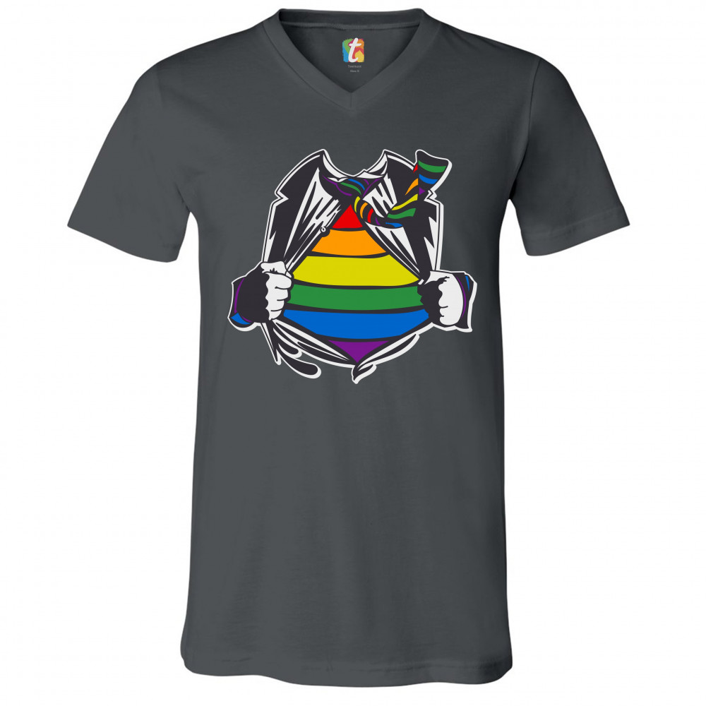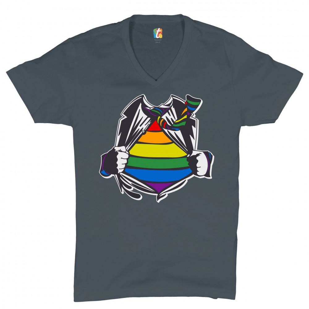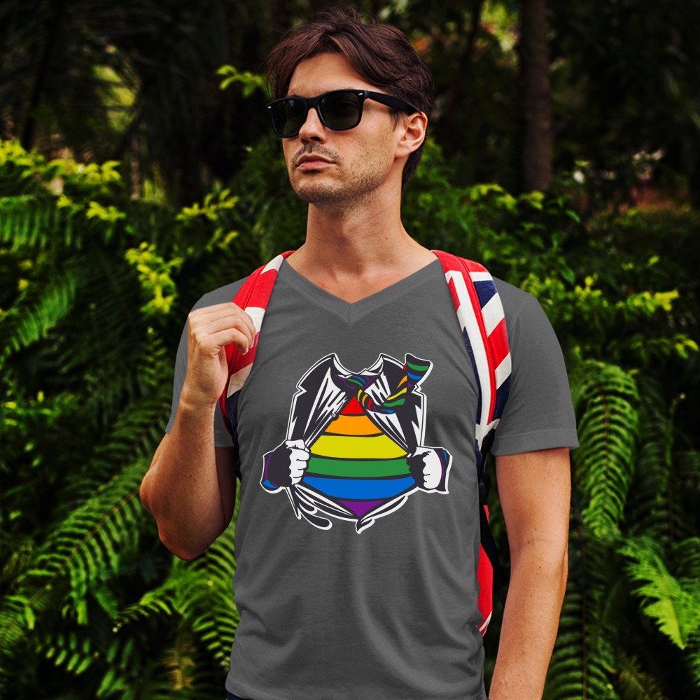 GAY SUPERHERO PARODY v-neck t-shirt lesbian bi transgender pride rainbow tee charcoal