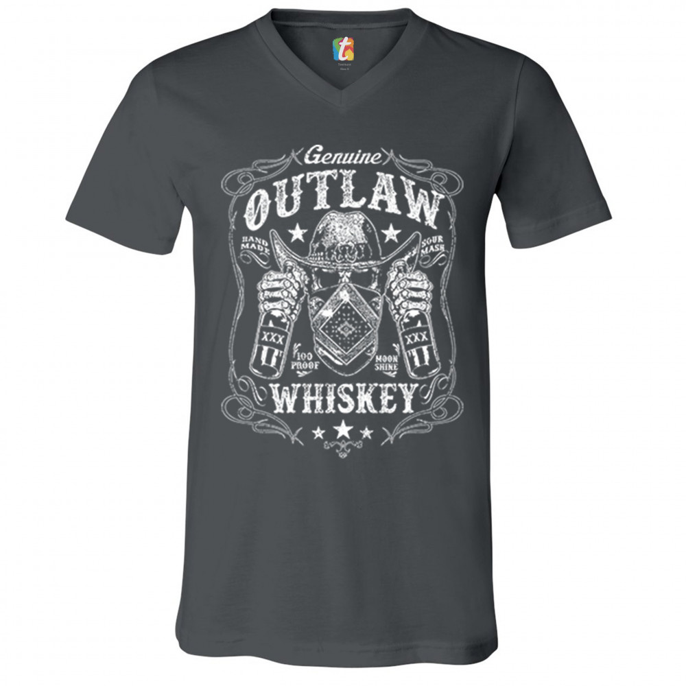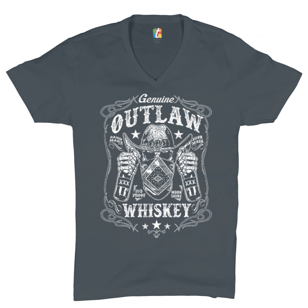 A print featuring a skeleton wearing a bandana and a cowboy hat holding a bottle in each of it's hands. The print says: "Genuine Outlaw Whiskey, Handmade Sour Mash, 100 Proof Moonshine". A great choice for an old school person who doesn't mind a glass or