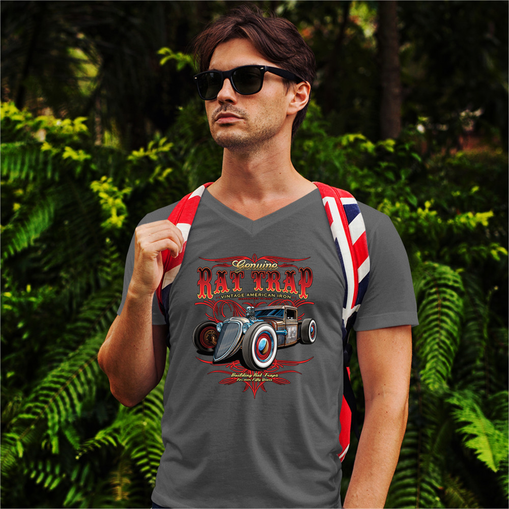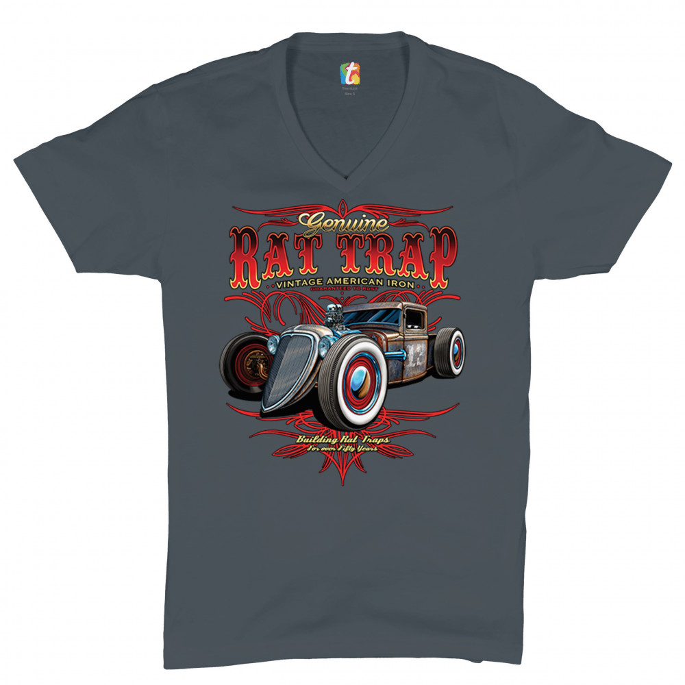 A print featuring a rusty rat rod with a number "13" on it's door. The prints says: "genuine rat trap, vintage American iron, guaranteed to rust" above the car and "bulding rat traps for over fifty years" below it. Great for Route 66 and hot rod fans.