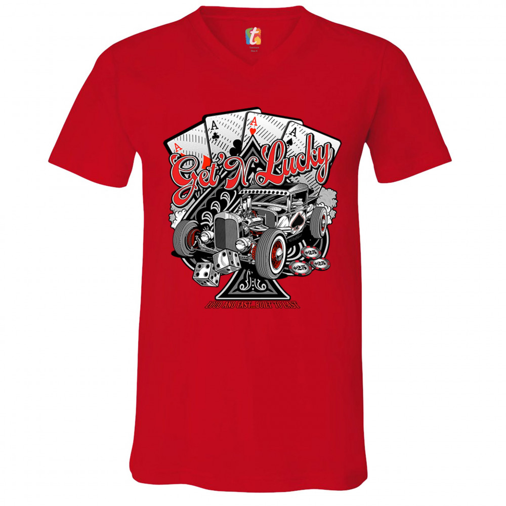 A print featuring a hot rod and a giant ace of spades behind it. In the background there are four aces of every suit. In front of the car there are 2 dices and several casino chips. The print says: "Get'n lucky, louad and fast… built to last". A great cho