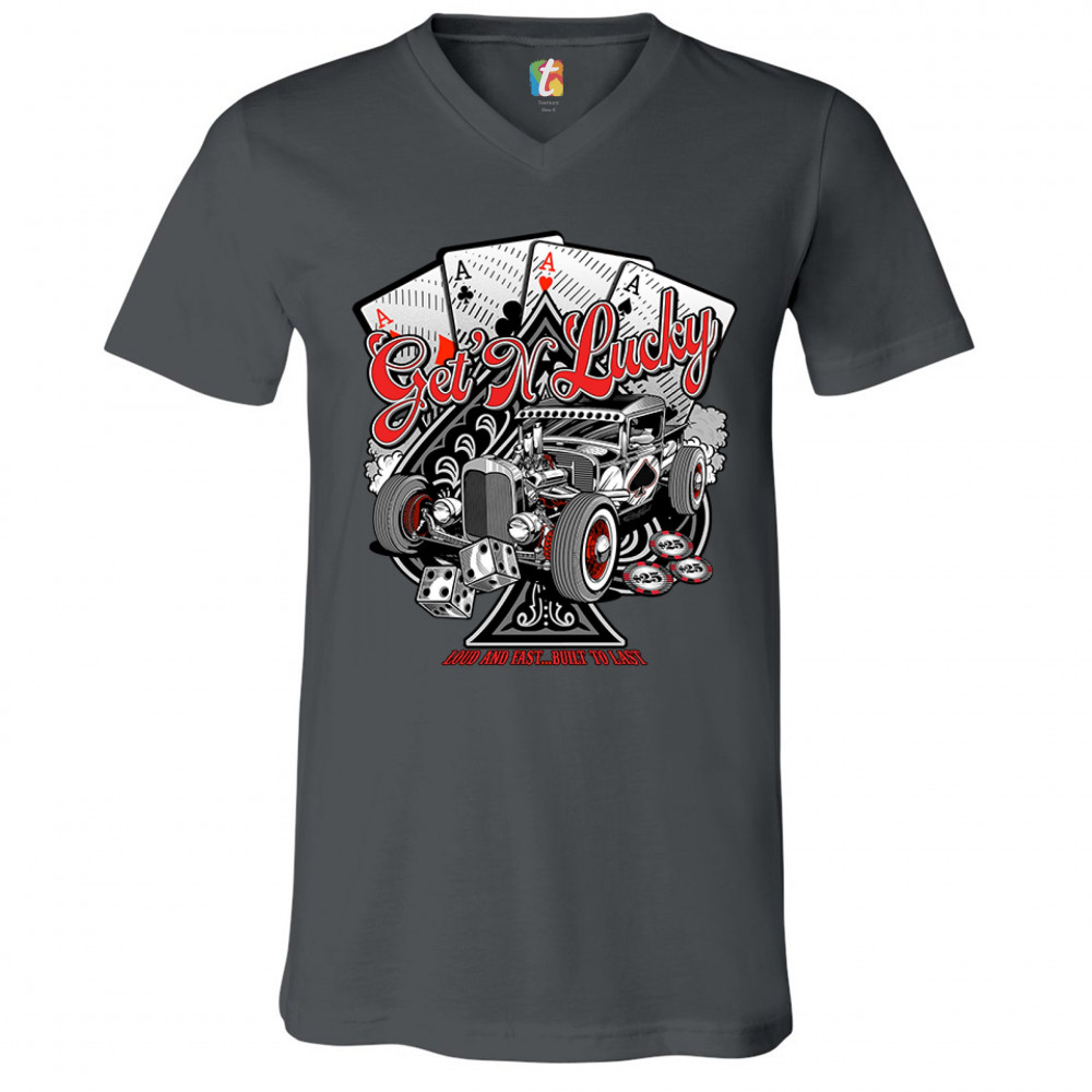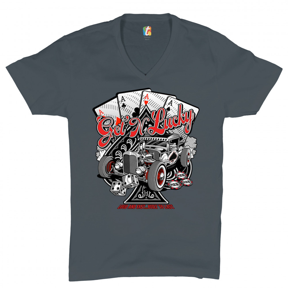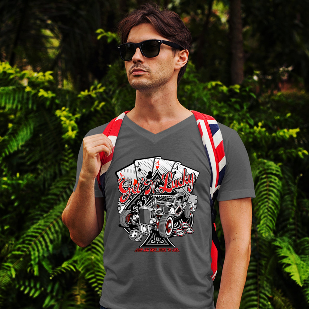 A print featuring a hot rod and a giant ace of spades behind it. In the background there are four aces of every suit. In front of the car there are 2 dices and several casino chips. The print says: "Get'n lucky, louad and fast… built to last". A great cho