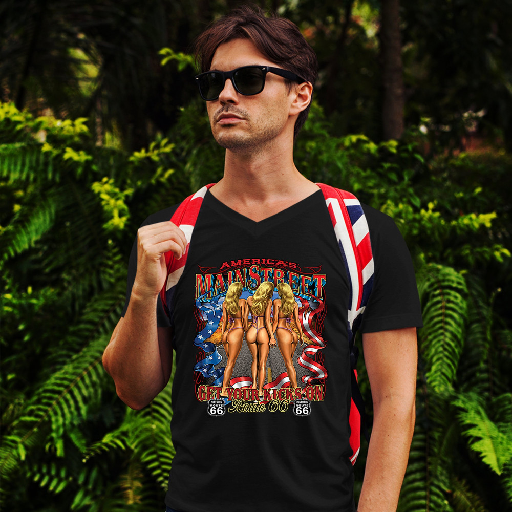 GET YOUR KICKS ON ROUTE 66 v-neck t-shirt sexy girls in bikinis biker tee black