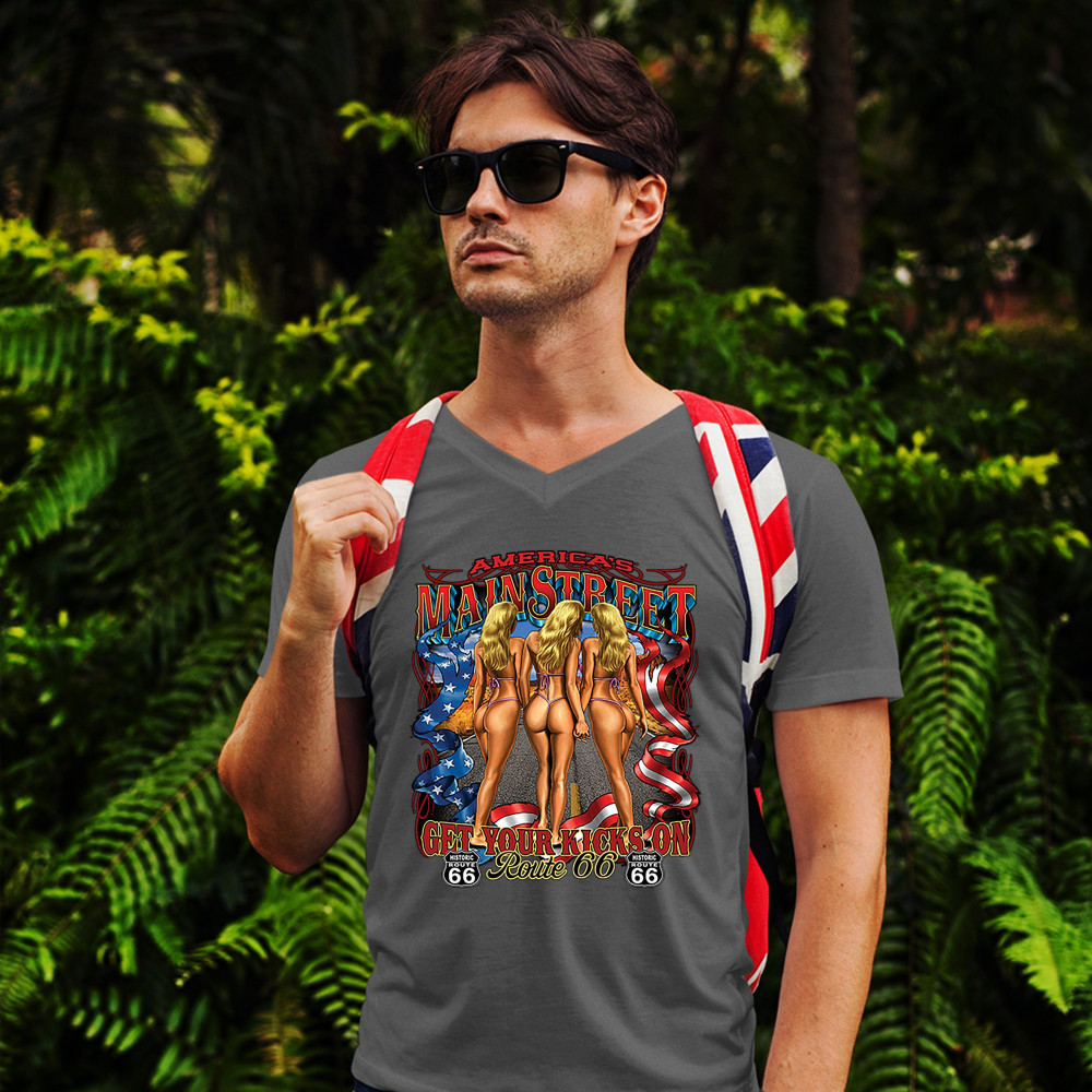 A print featuring three scantily-clad blondes holding each other's hands walking on a highway. The print says: "America's Main Street, Get Your Kicks on Route 66" and also features a ribbon with stars and stripes on it and two "Historic Route 66" signs. A