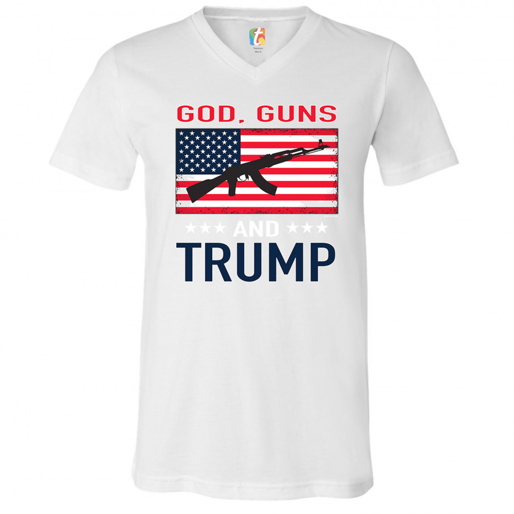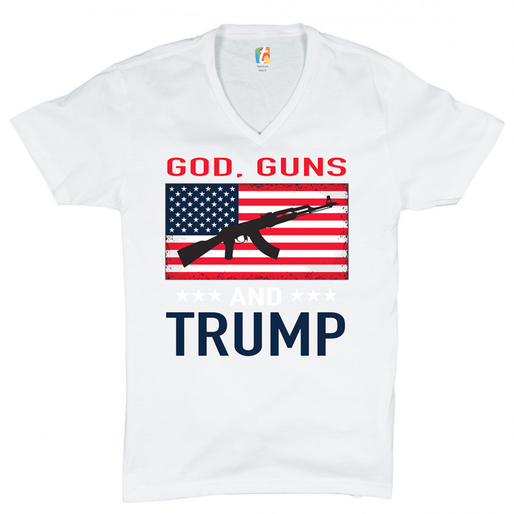 A political print saying "God, Guns and Trump". In the center there is the American flag with a silhouette of AK-47 rifle on it. A great choice to wear for a Trump rally or give as a gift to a Donald Trump and Mike Pence supporter before 2020 presidential elections.