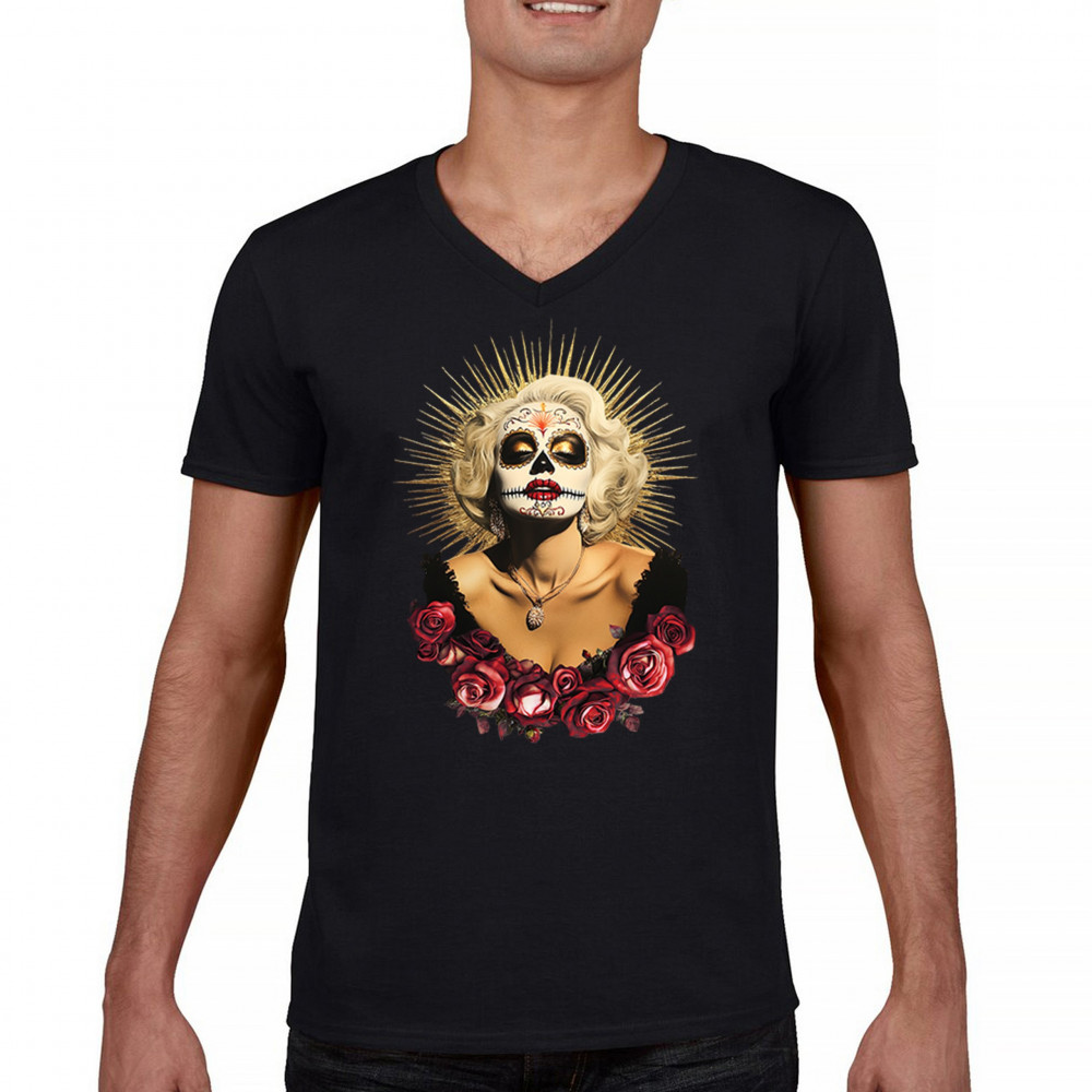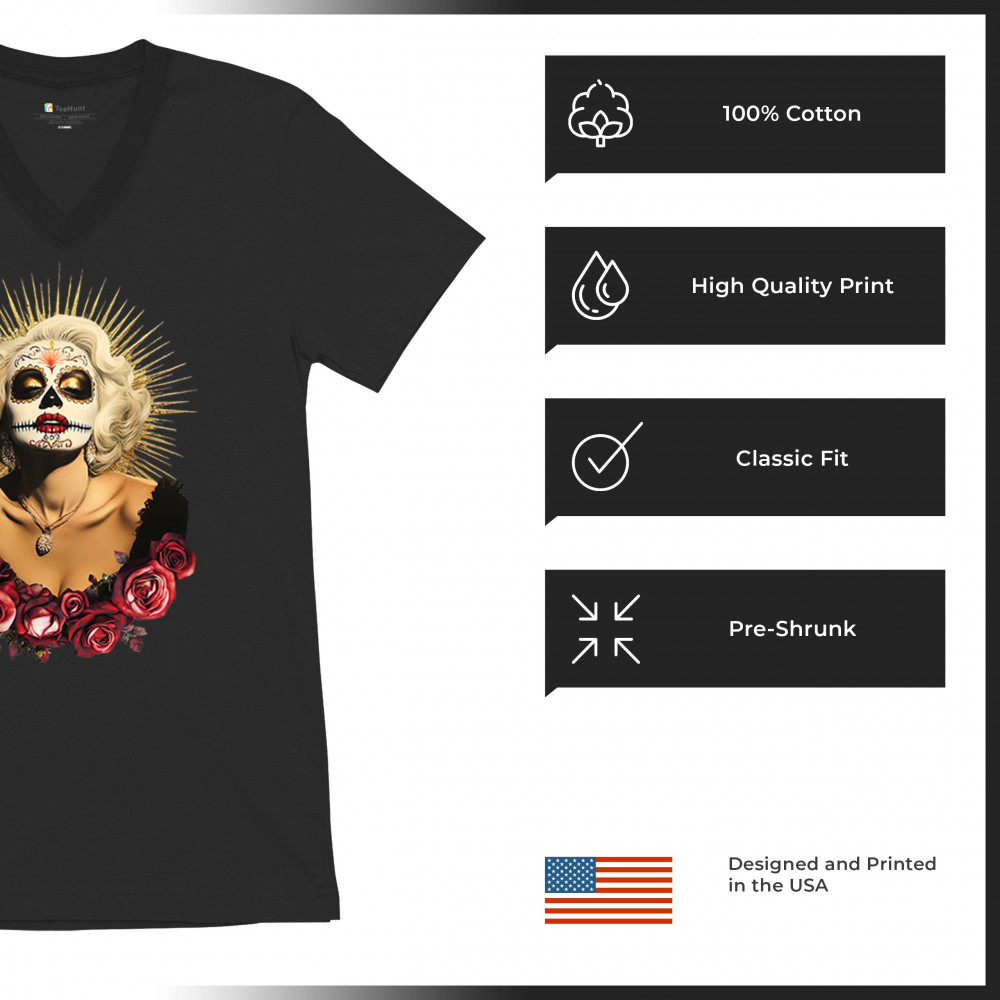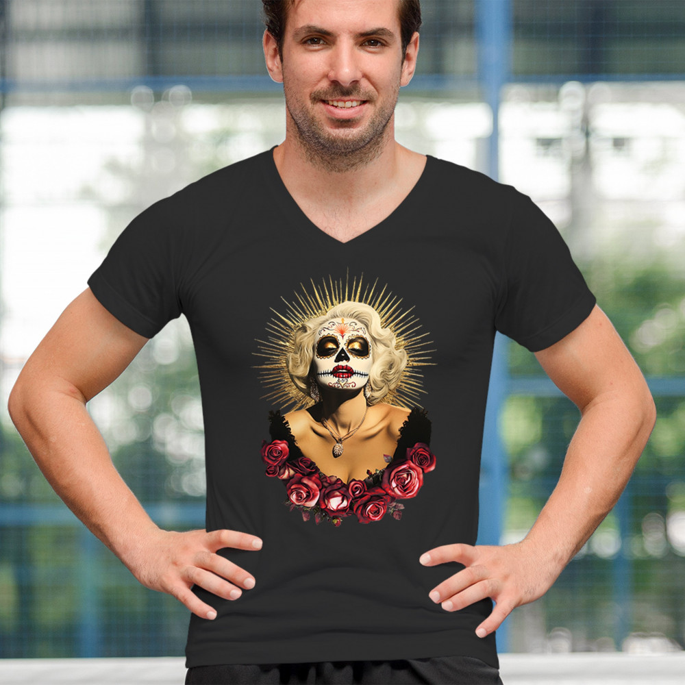 This bold and beautiful sugar skull design features a glamorous calavera woman crowned in a golden halo and framed by roses. A divine tribute to Dia de los Muertos, this look blends vintage glam, Latin culture, makeup artistry, and sacred symbolism. Perfect for fans of gothic beauty, Halloween, and heritage expression.
