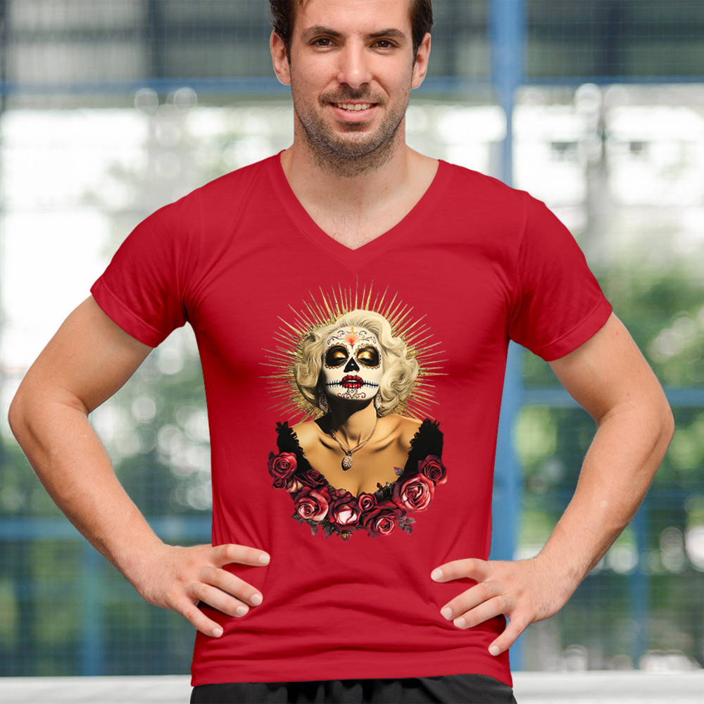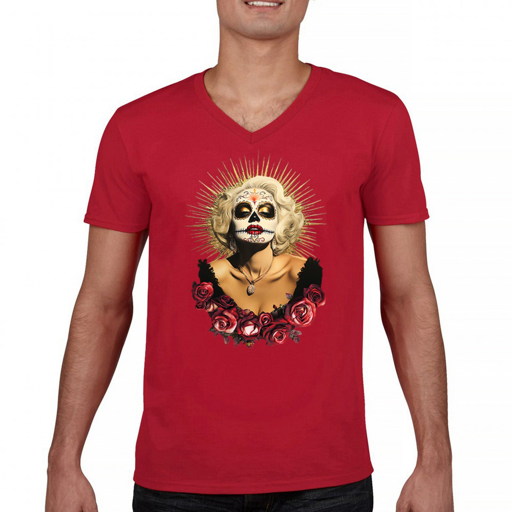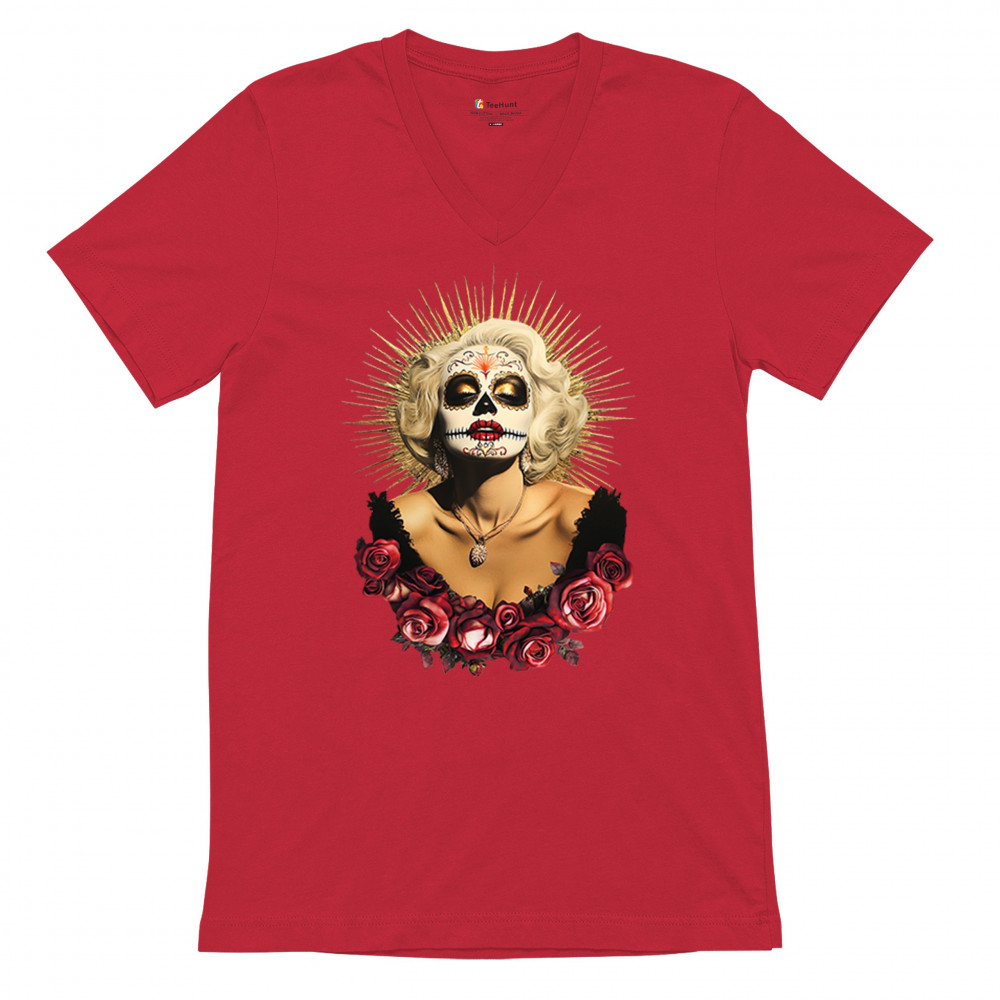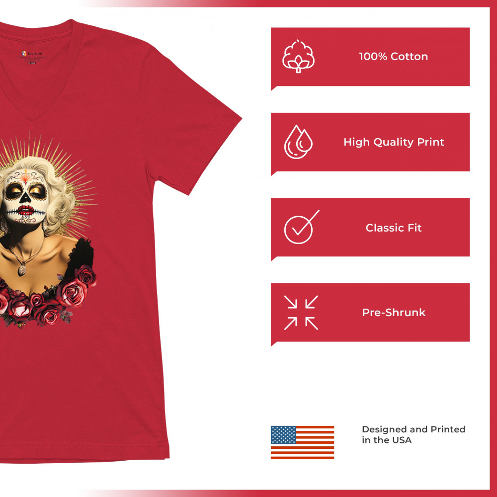 This bold and beautiful sugar skull design features a glamorous calavera woman crowned in a golden halo and framed by roses. A divine tribute to Dia de los Muertos, this look blends vintage glam, Latin culture, makeup artistry, and sacred symbolism. Perfect for fans of gothic beauty, Halloween, and heritage expression.