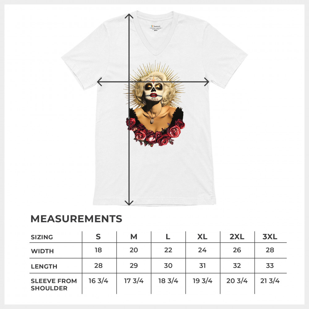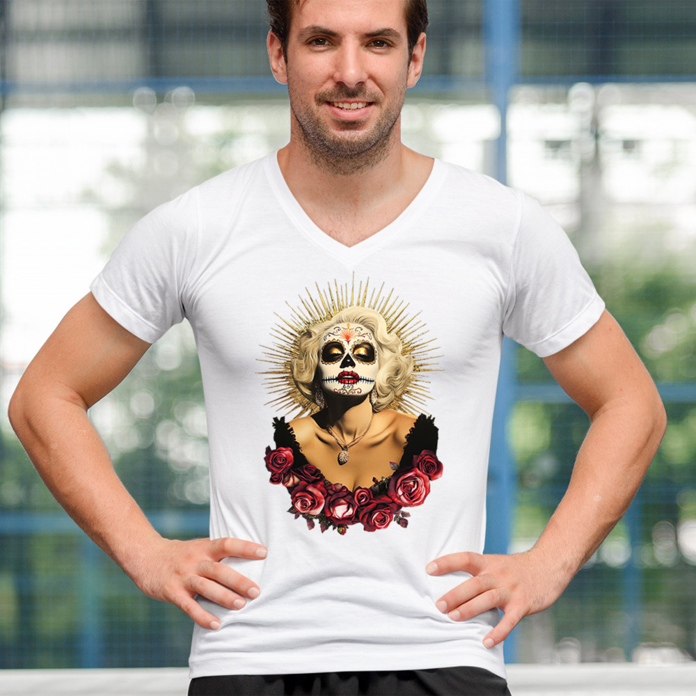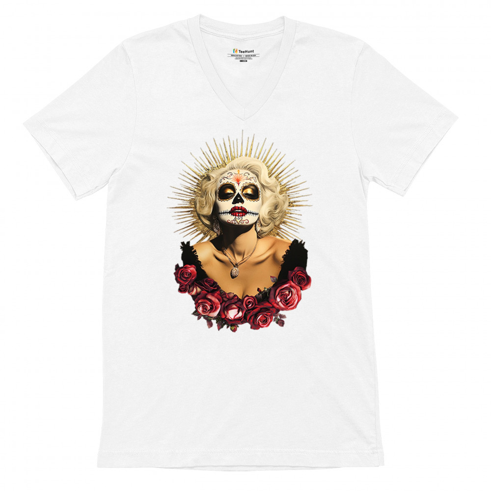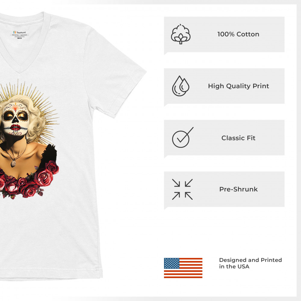 This bold and beautiful sugar skull design features a glamorous calavera woman crowned in a golden halo and framed by roses. A divine tribute to Dia de los Muertos, this look blends vintage glam, Latin culture, makeup artistry, and sacred symbolism. Perfect for fans of gothic beauty, Halloween, and heritage expression.