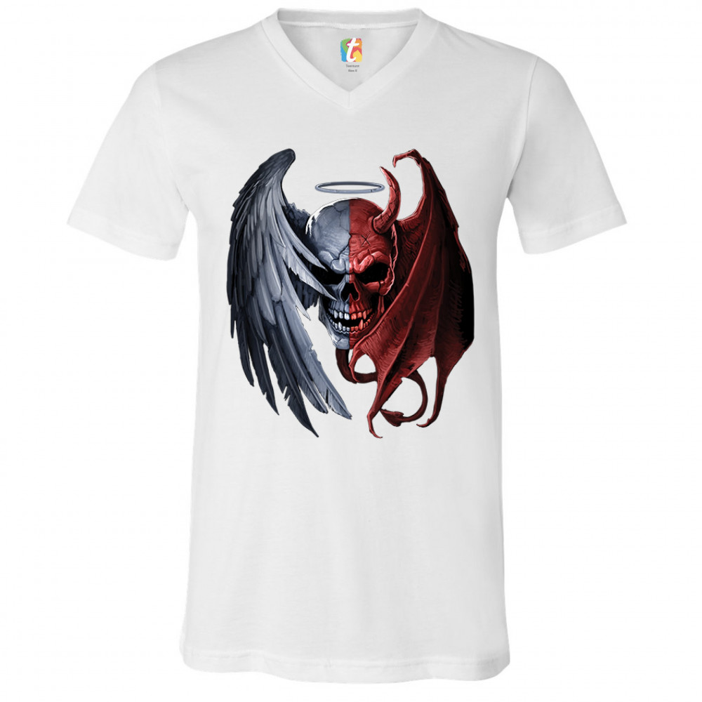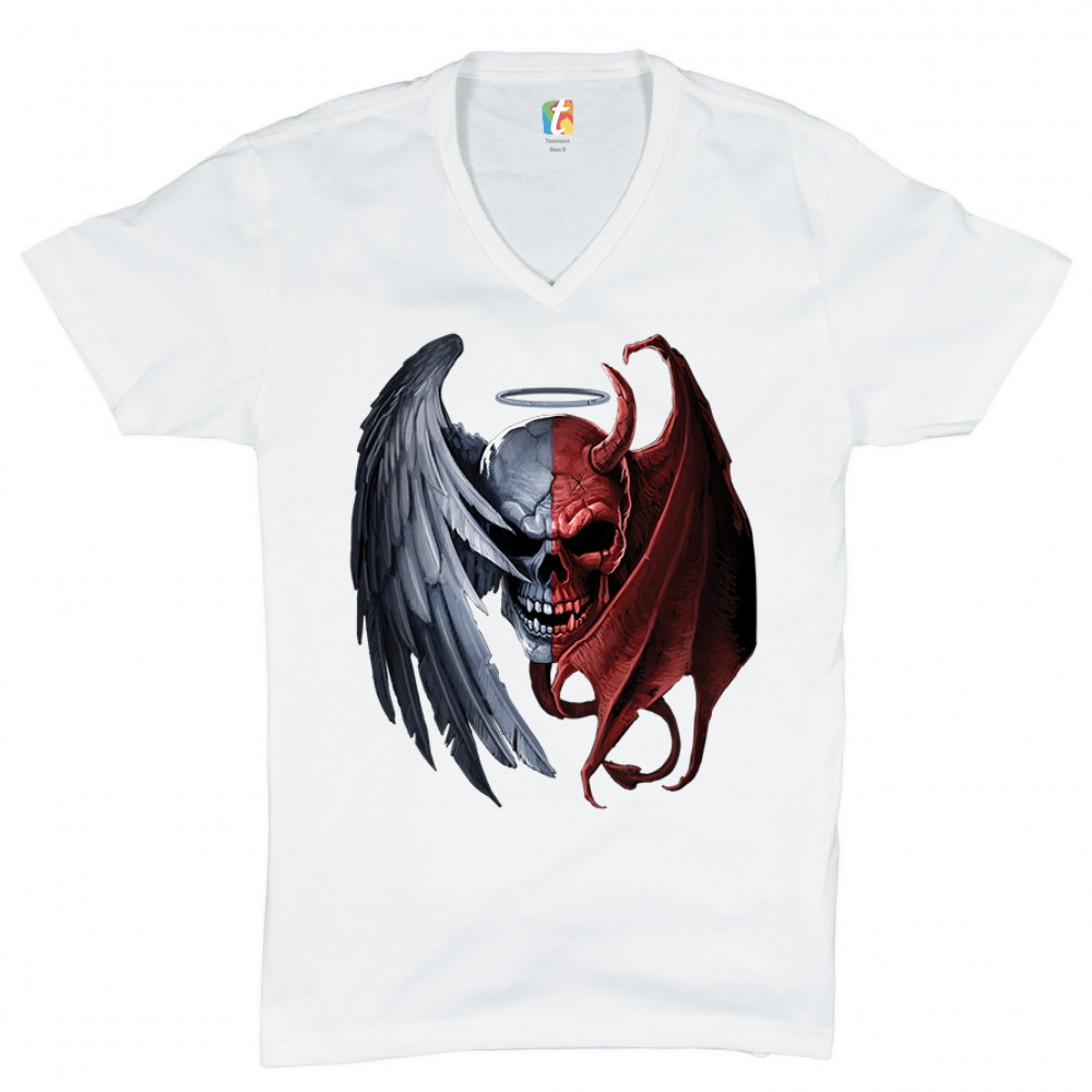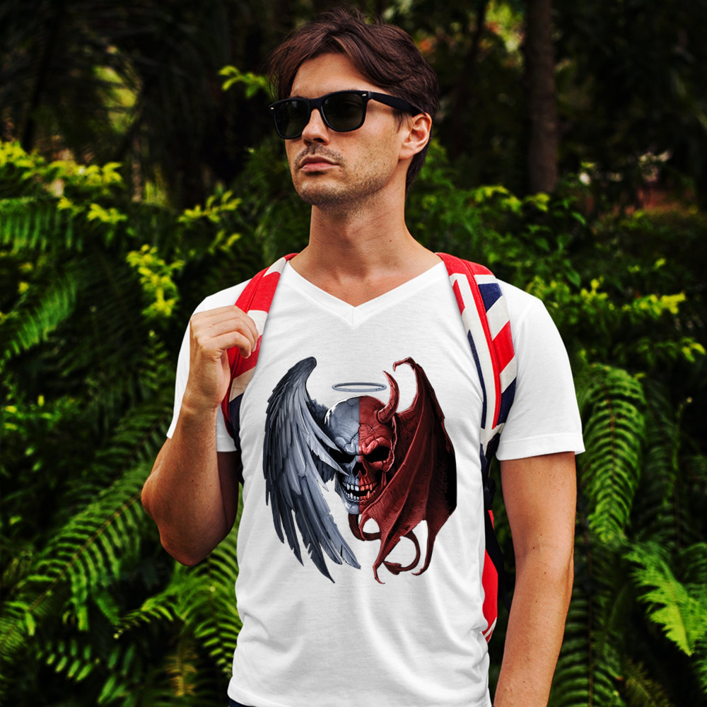 A print featuring a skull face, one half of which is light and has an angel's wing covering it and the other is dark with a horn sticking out of the forehead and a demon's wing. Below the skull you can see a demon's tail and a halo above it. A great