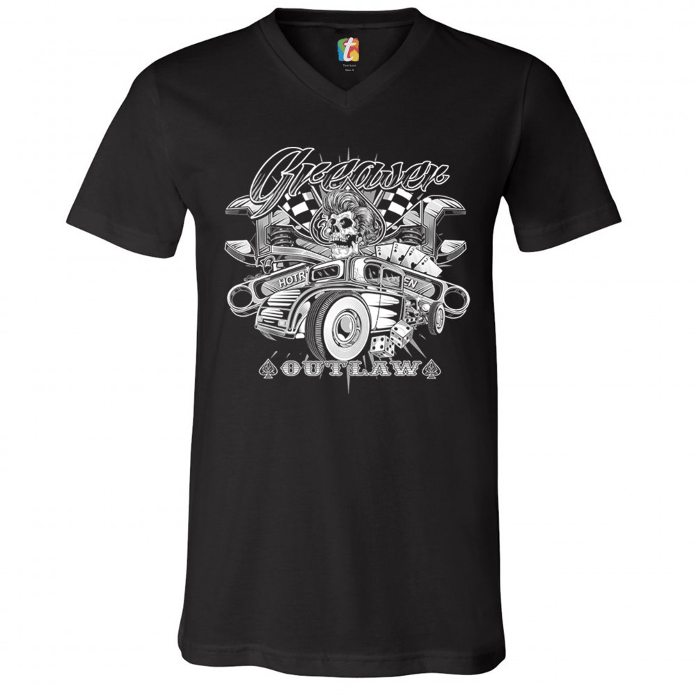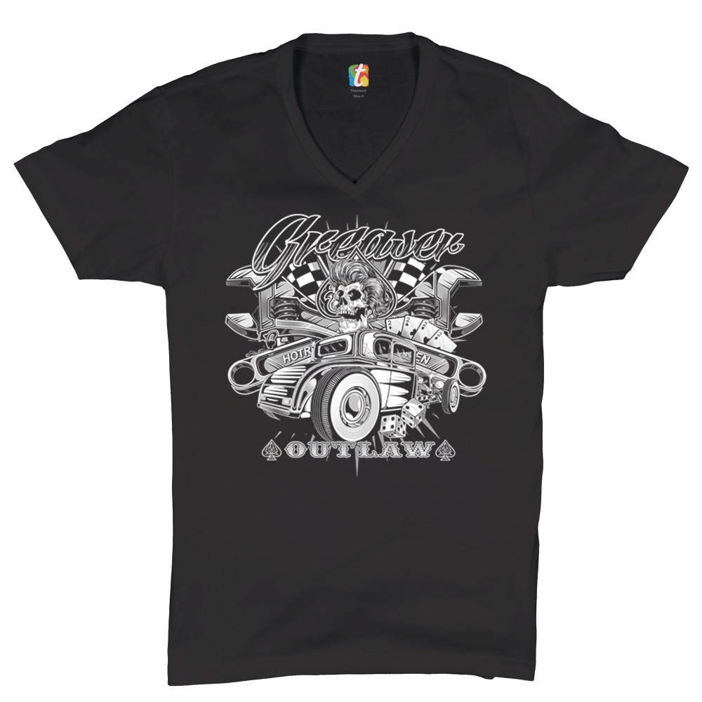 A print featuring a skull, a vintage Hot Rod and a pair of dice. In the background there are crossed wrenches, playing cards and racing flags. The print says: "Greaser outlaw". A great choice for a fan of customized American classic cars and hot rods.