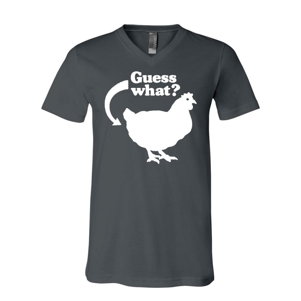 GUESS WHAT? CHICKEN BUTT v-neck t-shirt funny ironic offensive humor tee charcoal