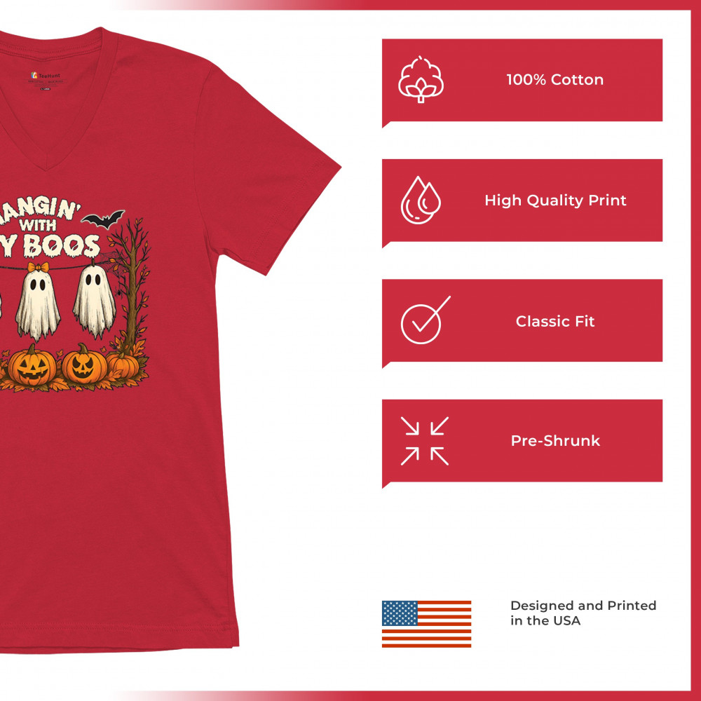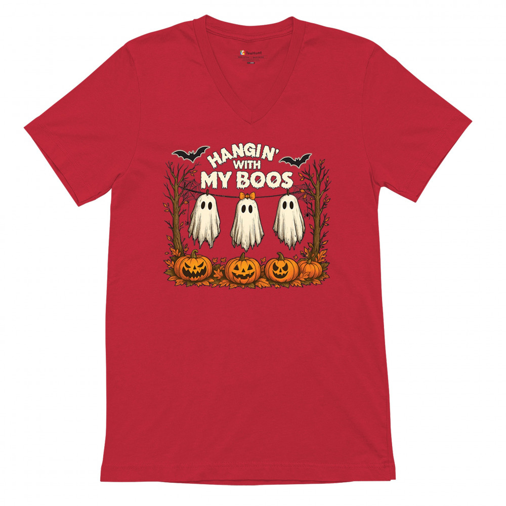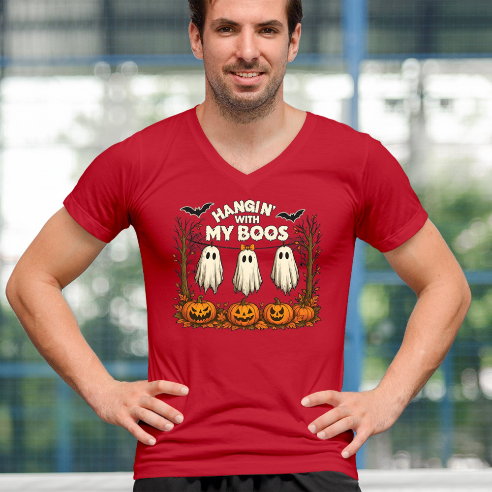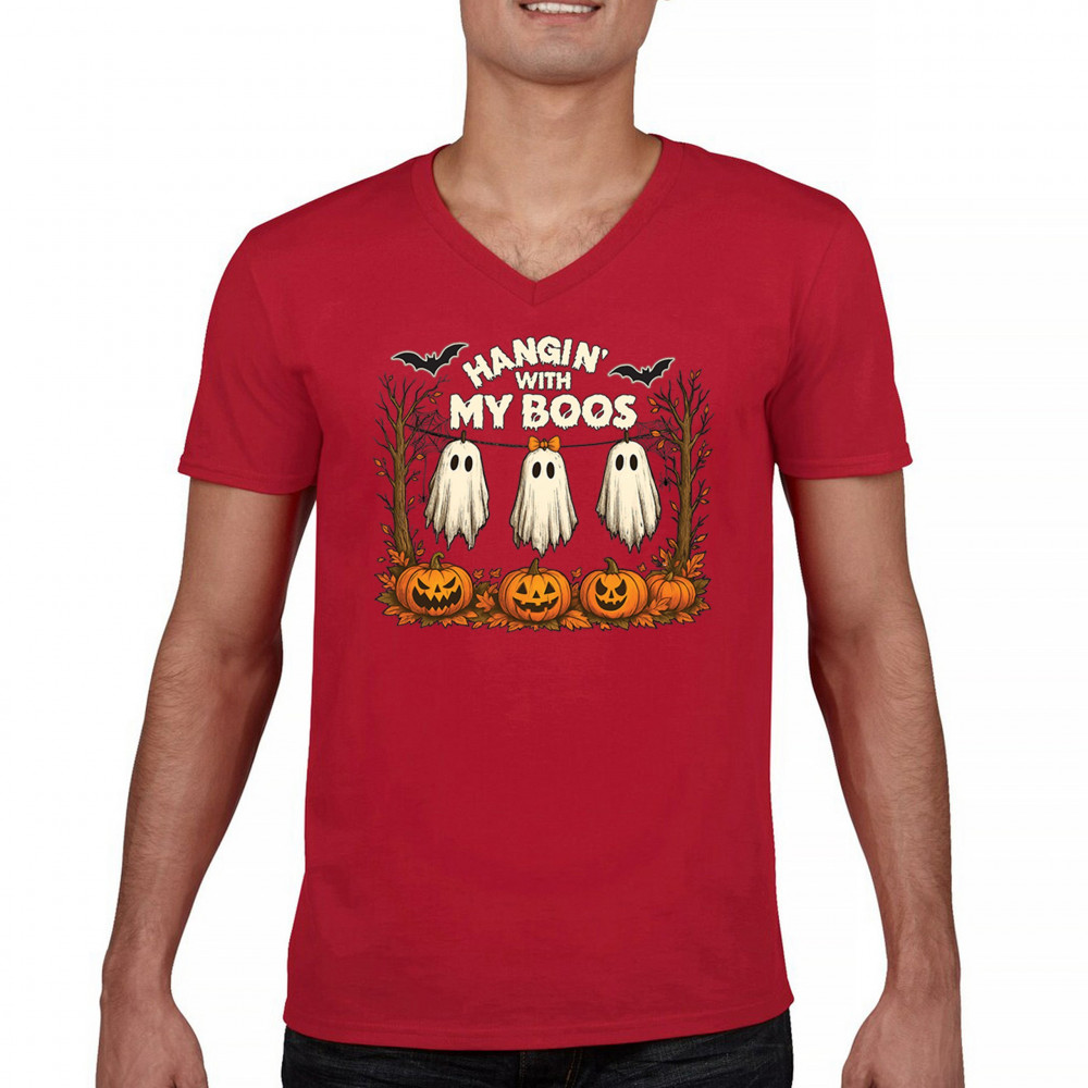 Hangin With My Boos design featuring spooky ghosts, jack o lanterns, and haunted house humor. Perfect for Halloween night, October 31, and parties.
