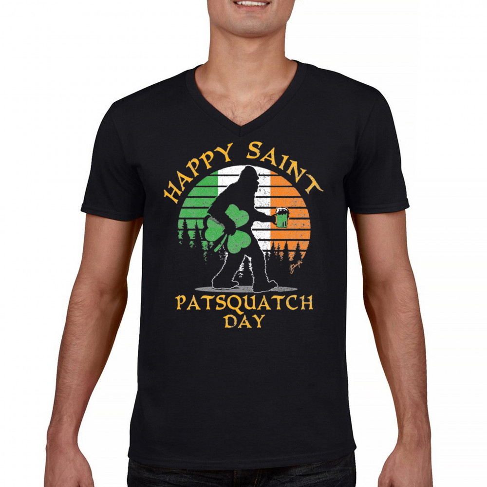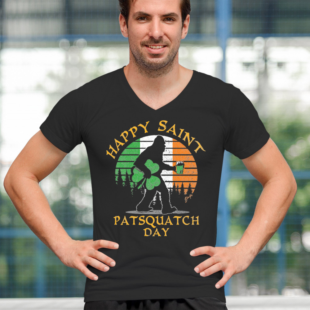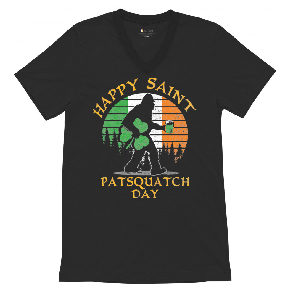 HAPPY SAINT PATSQUATCH DAY v-neck t-shirt st. patrick's big foot shamrock tee black