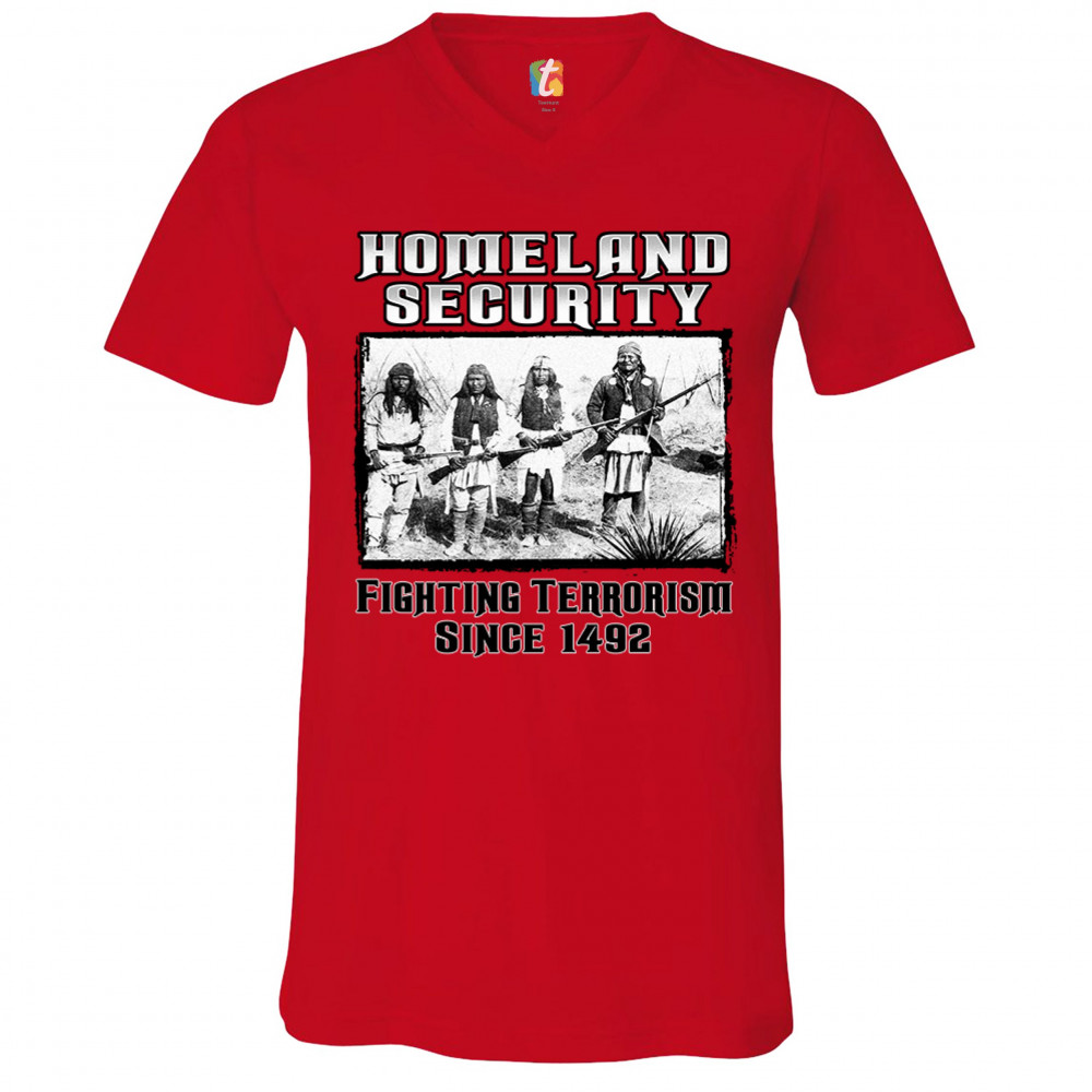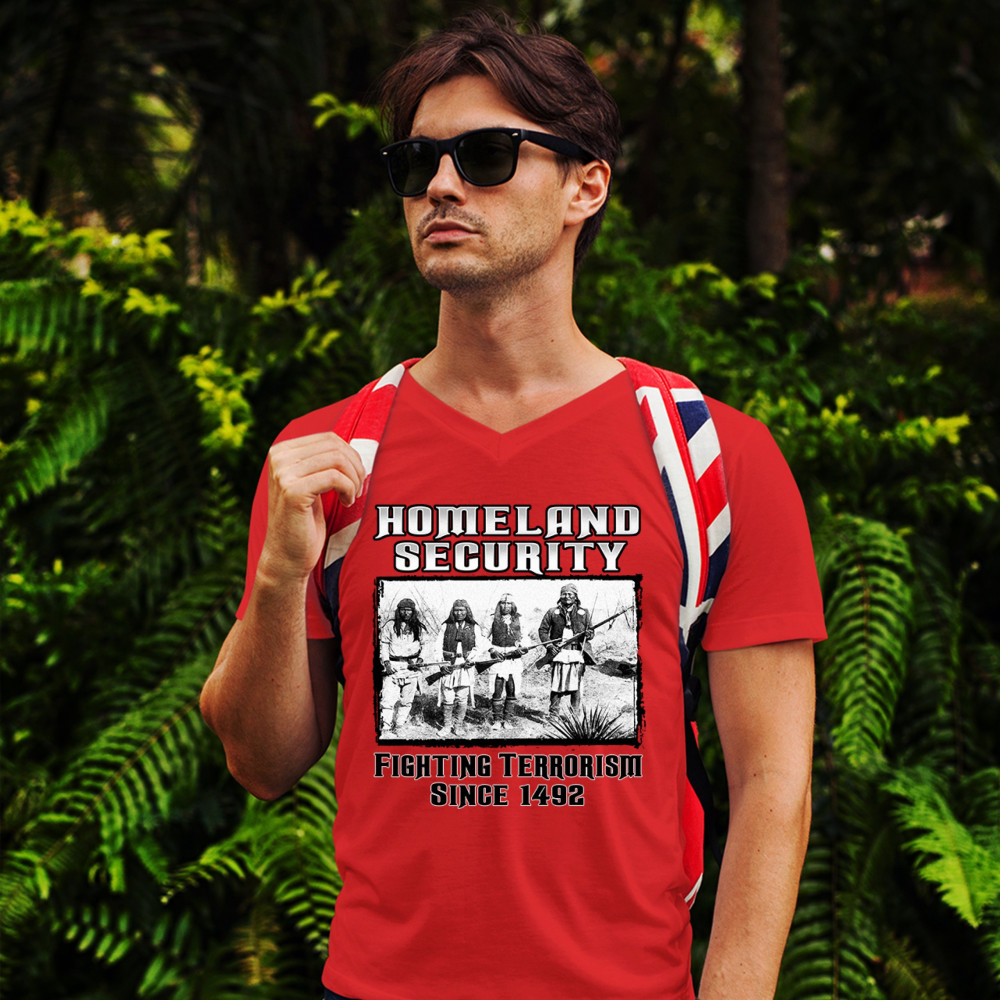HOMELAND SECURITY v-neck t-shirt native american indigenous patriotic tee red