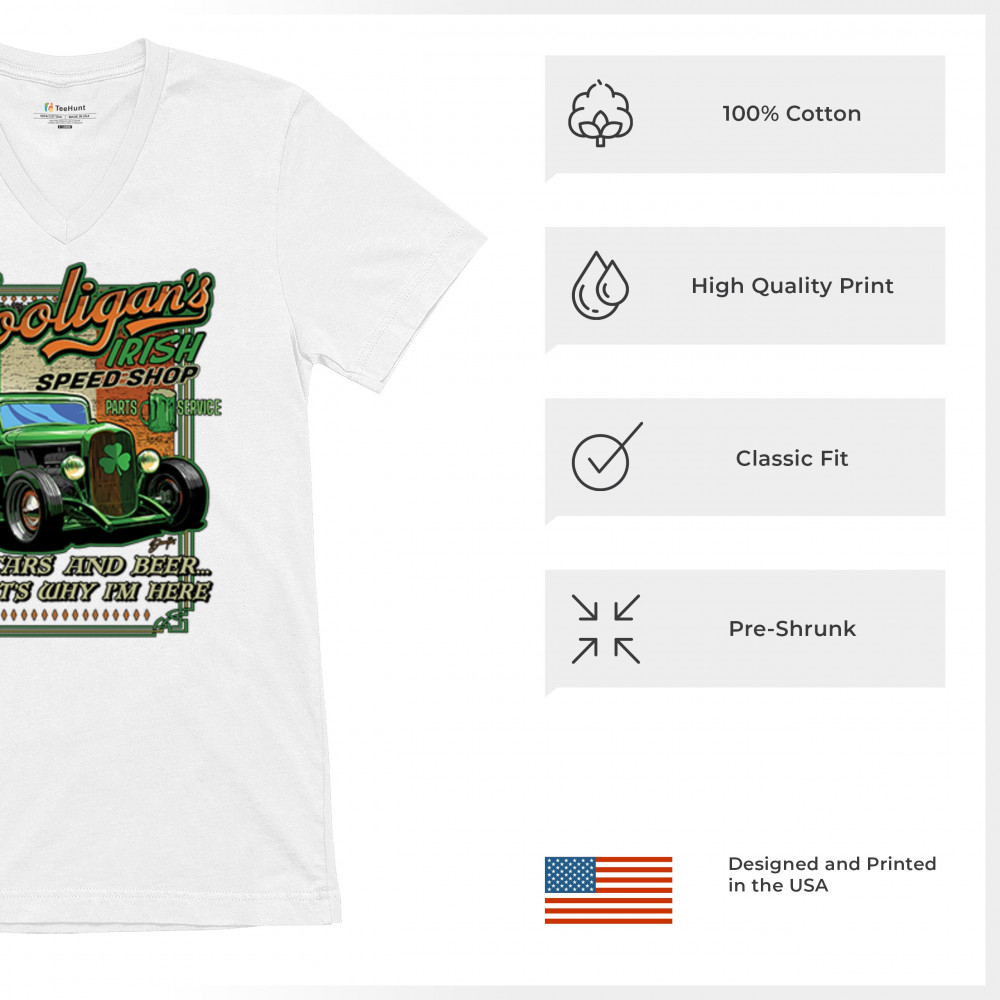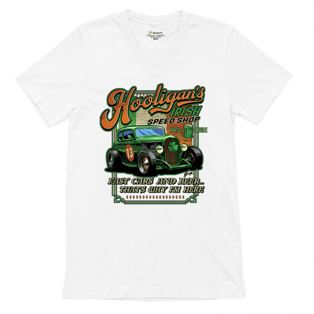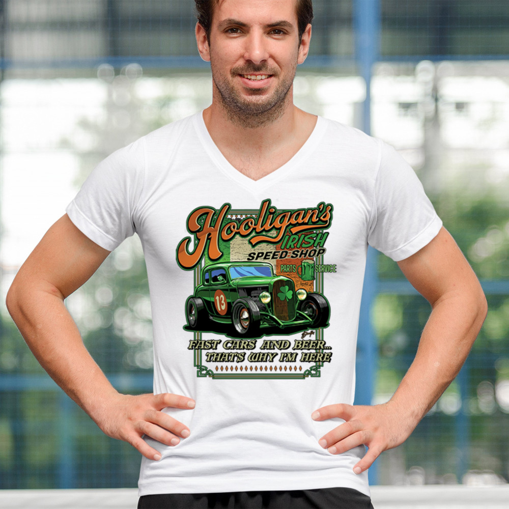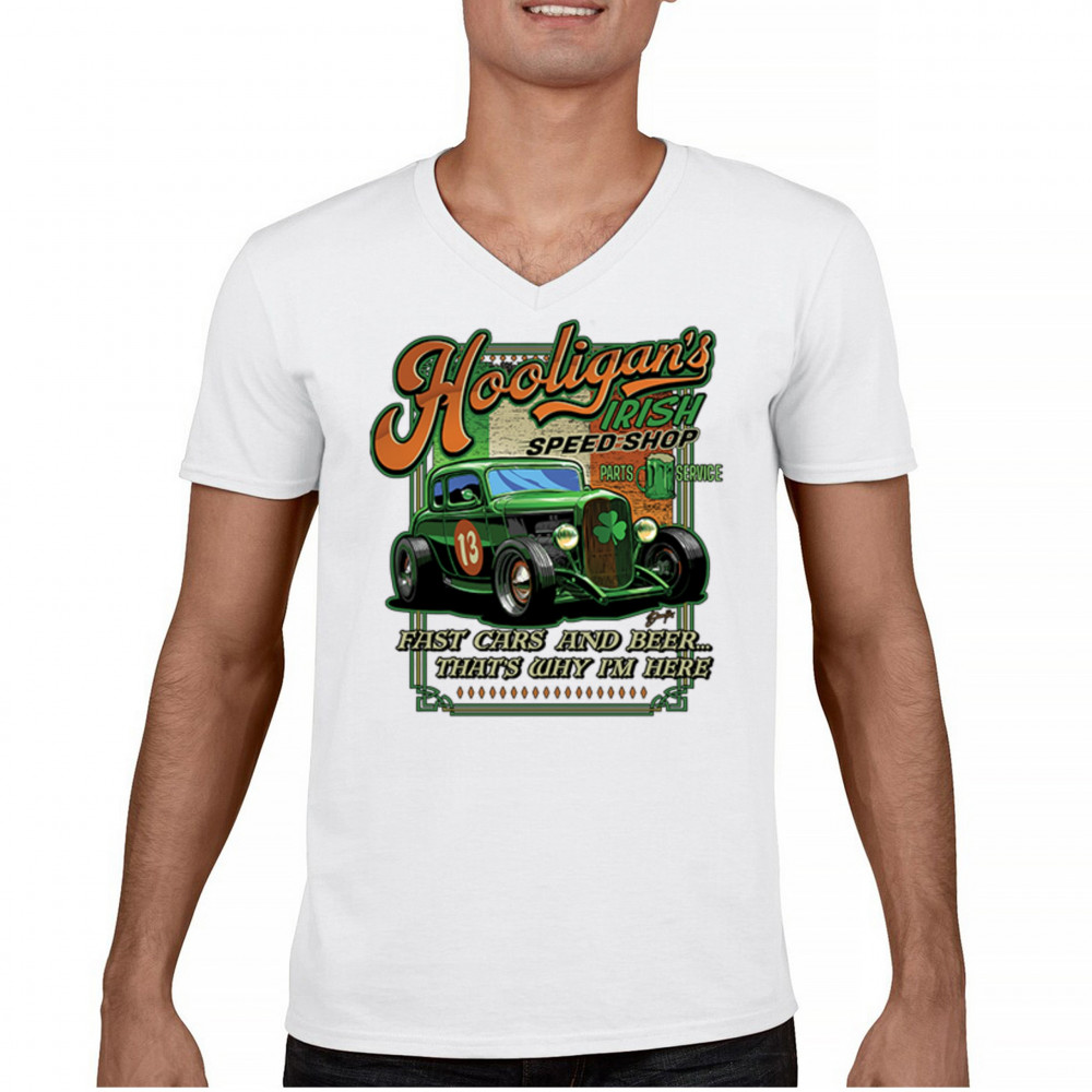 HOOLIGAN'S IRISH SPEED SHOP hooligans irish speed shop st patricks day v-neck t-shirt hot rod shamrock tee white
