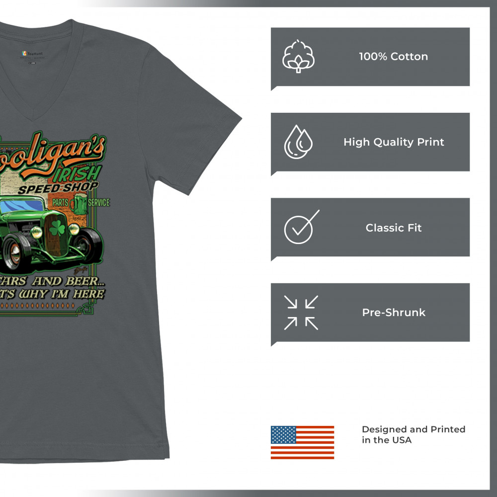 HOOLIGAN'S IRISH SPEED SHOP hooligans irish speed shop st patricks day v-neck t-shirt hot rod shamrock tee charcoal