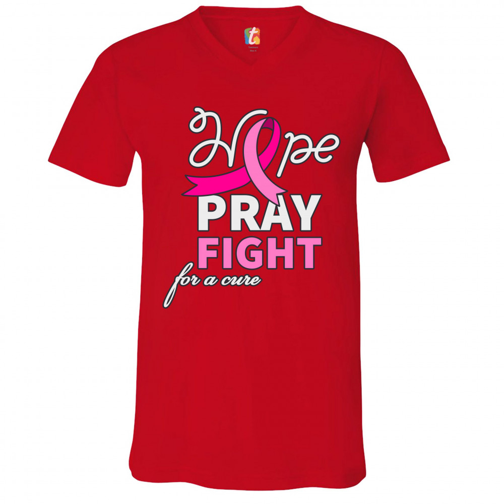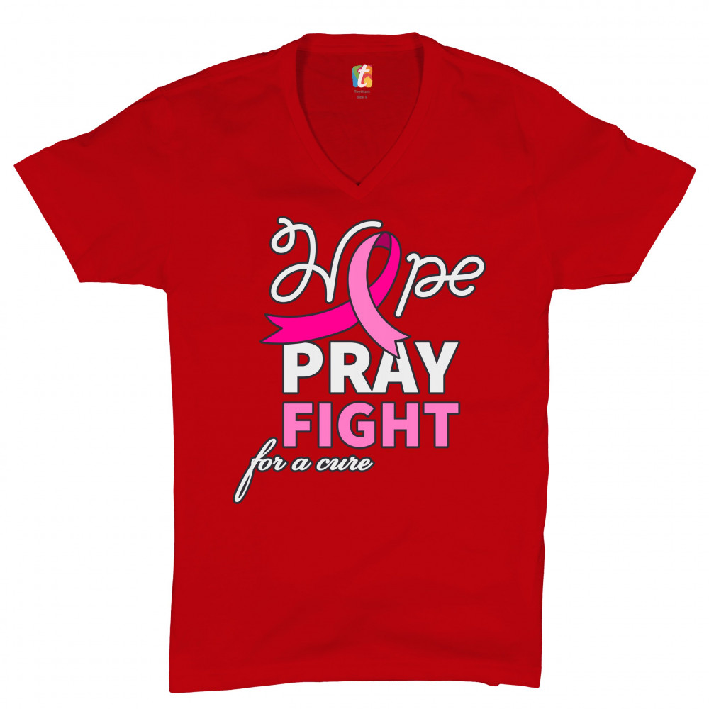 HOPE PRAY FIGHT FOR A CURE v-neck t-shirt cancer awareness pink ribbon tee red