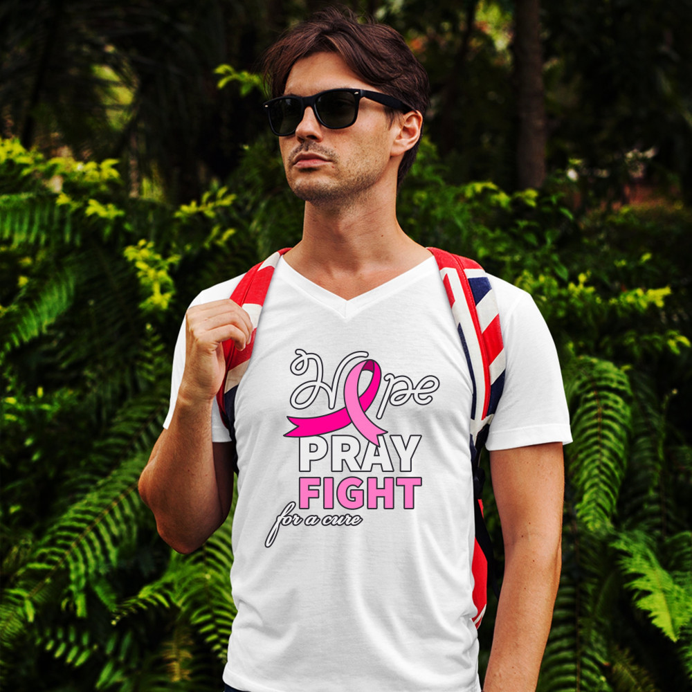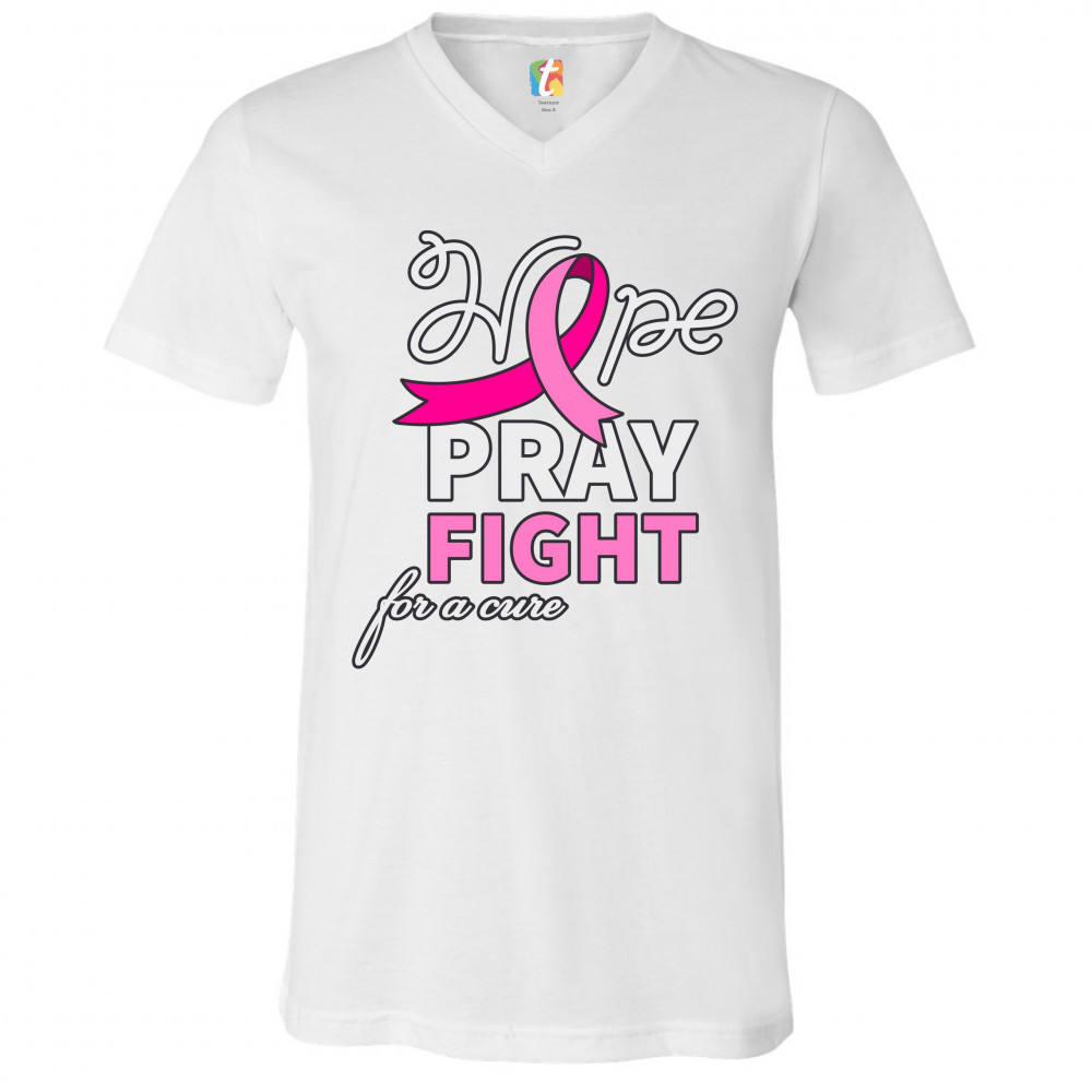 HOPE PRAY FIGHT FOR A CURE v-neck t-shirt cancer awareness pink ribbon tee white