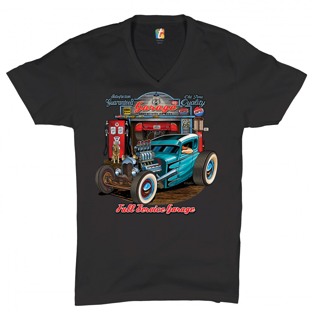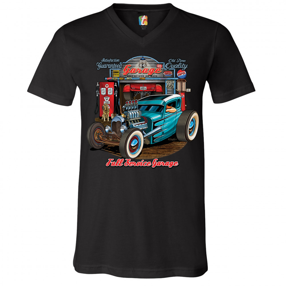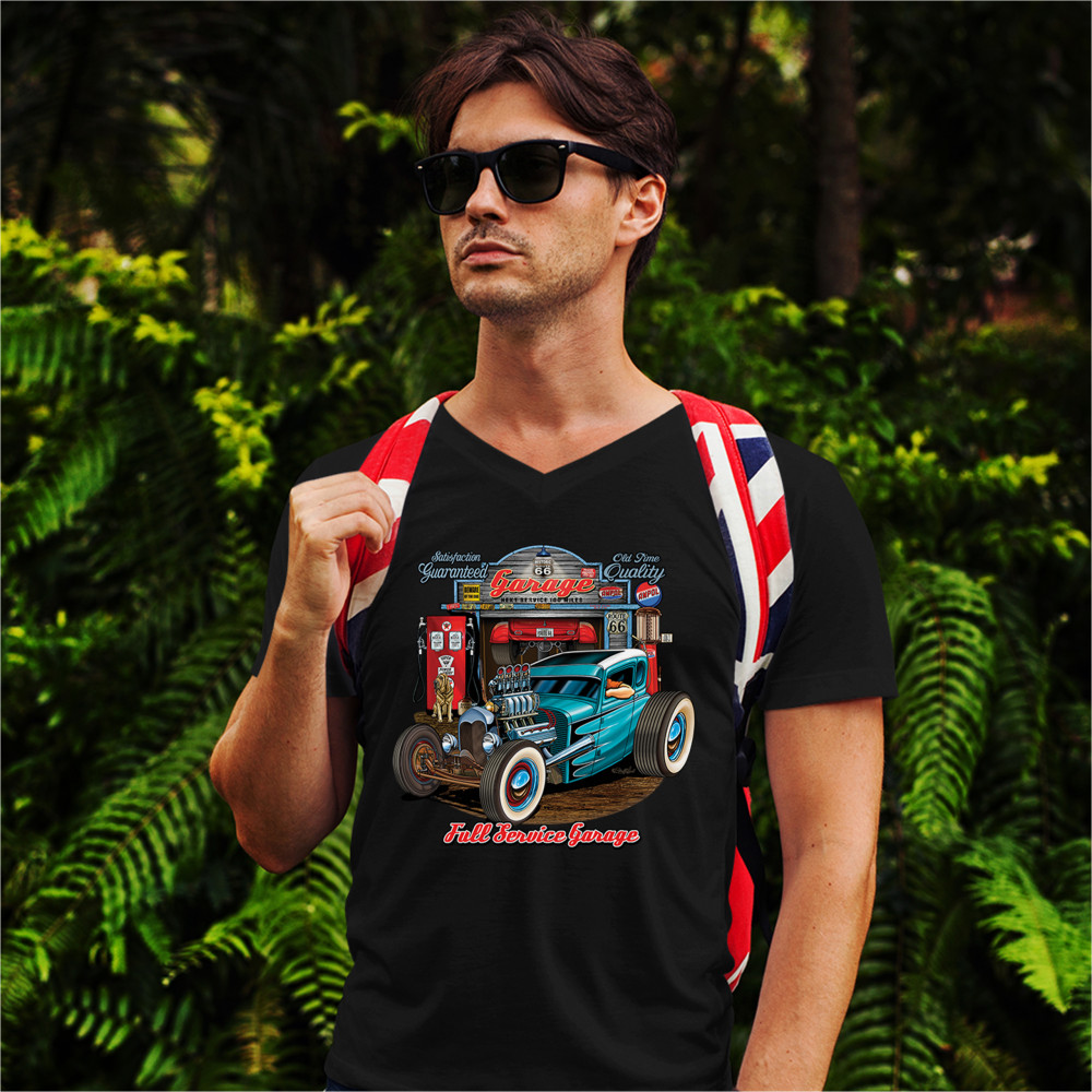 A print featuring a beautiful blue hot rod and a garage behind it. The garage has numerous signs on it which says :"Satisfaction guaranteed", "Old time quality", "Historic Route 66". Under the car it says: "Full service garage". Great for Route 66 and hot rod fans.