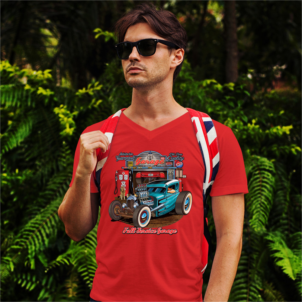 A print featuring a beautiful blue hot rod and a garage behind it. The garage has numerous signs on it which says :"Satisfaction guaranteed", "Old time quality", "Historic Route 66". Under the car it says: "Full service garage". Great for Route 66 and hot rod fans.