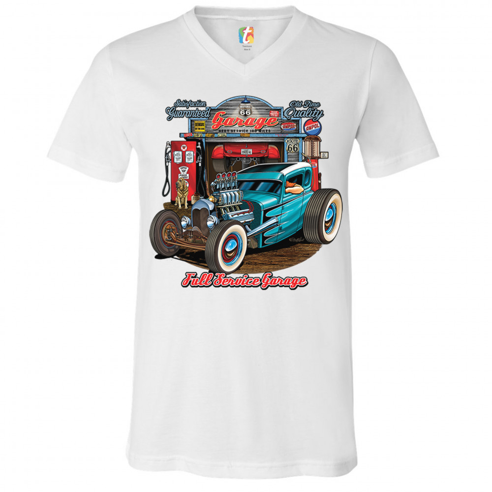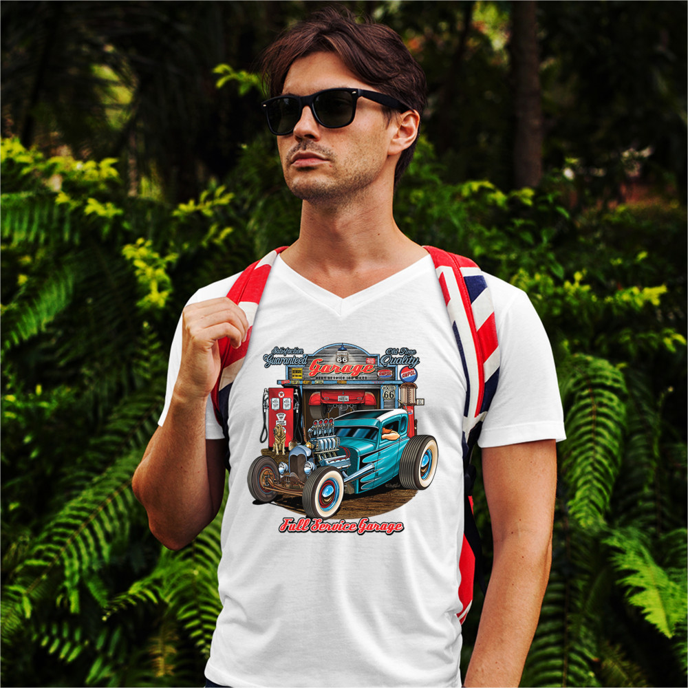 A print featuring a beautiful blue hot rod and a garage behind it. The garage has numerous signs on it which says :"Satisfaction guaranteed", "Old time quality", "Historic Route 66". Under the car it says: "Full service garage". Great for Route 66 and hot rod fans.