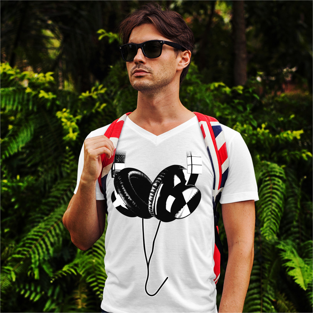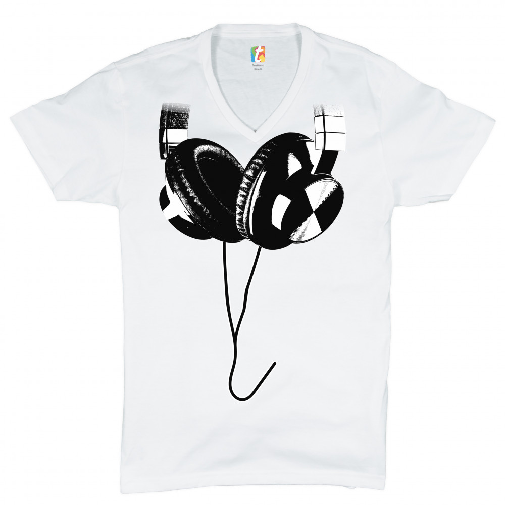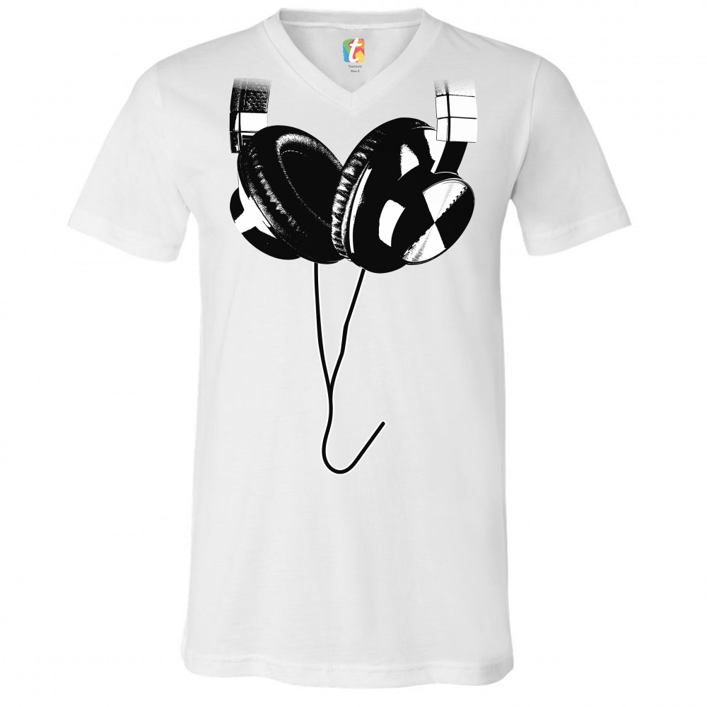HUGE HANGING HEADPHONES v-neck t-shirt dj music tee white