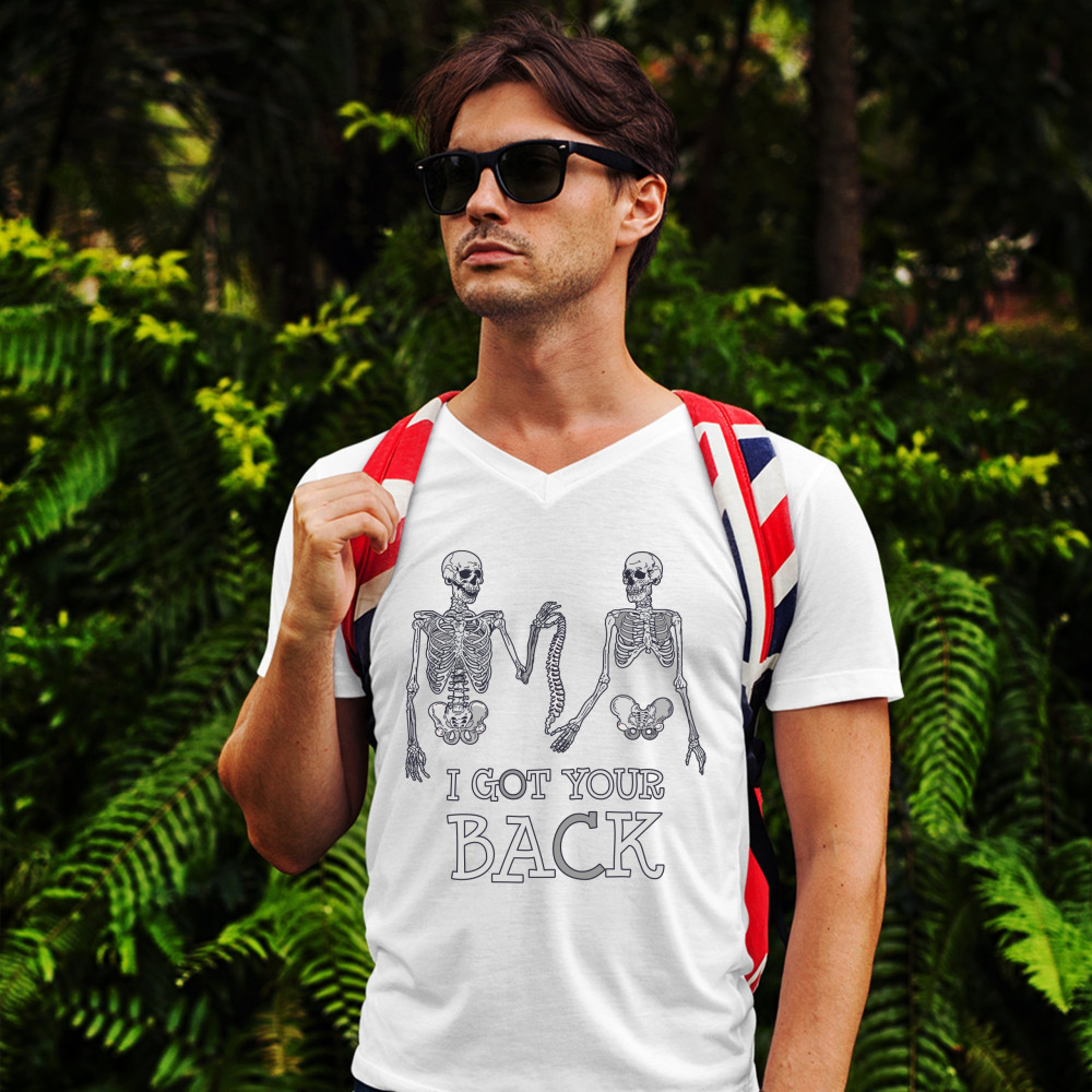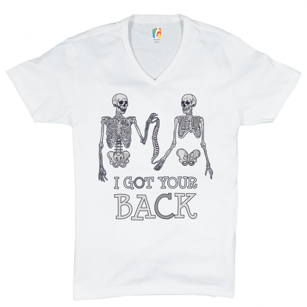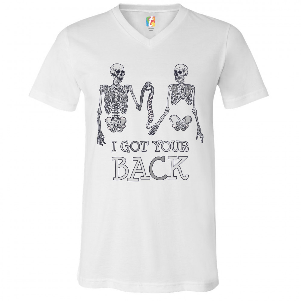 I GOT YOUR BACK v-neck t-shirt happy halloween spooky skeletons tee white