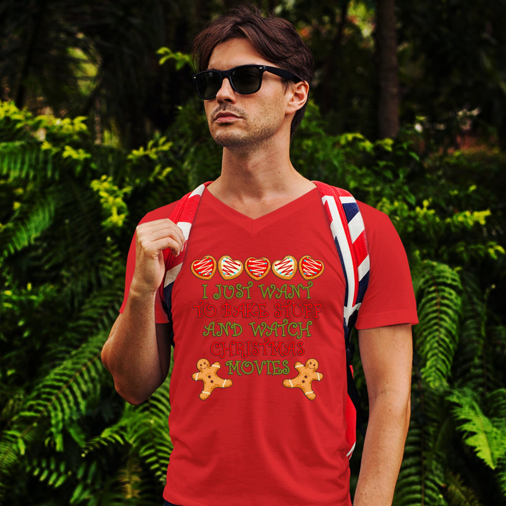 A print saying: "I just want to bake stuff and watch Christmas Movies". The print features two gingerbread men in the bottom and five heart-shaped cookies in the top. Amazing choice to make people smile and spread positive vibes on Christmas Eve.