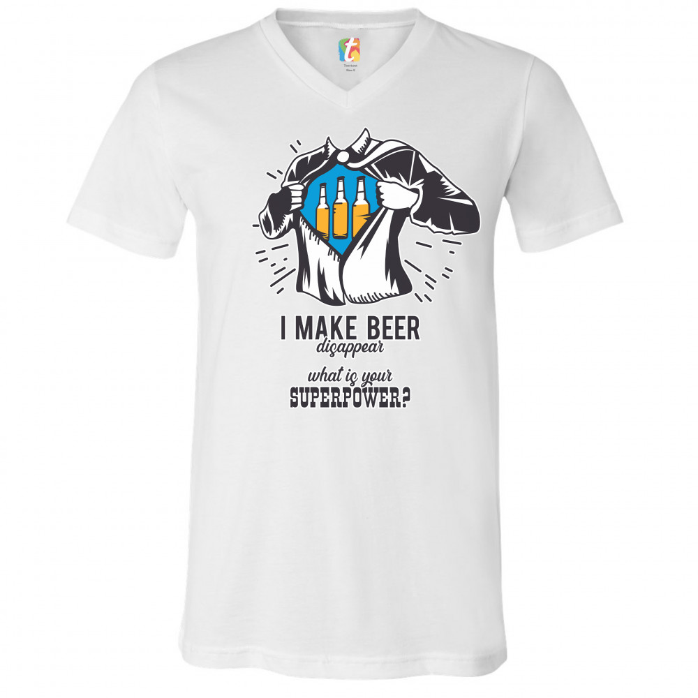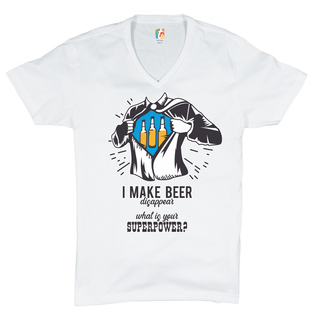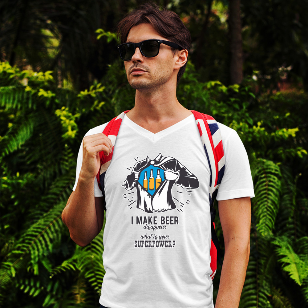 A funny print featuring a torso of man, who is ripping his shirt, exposing a picture of three bottles of beer. Underneath the picture the print says: "I make beer disappear. What is your superpower?". Great choice as a gift for Father's Day celebration.