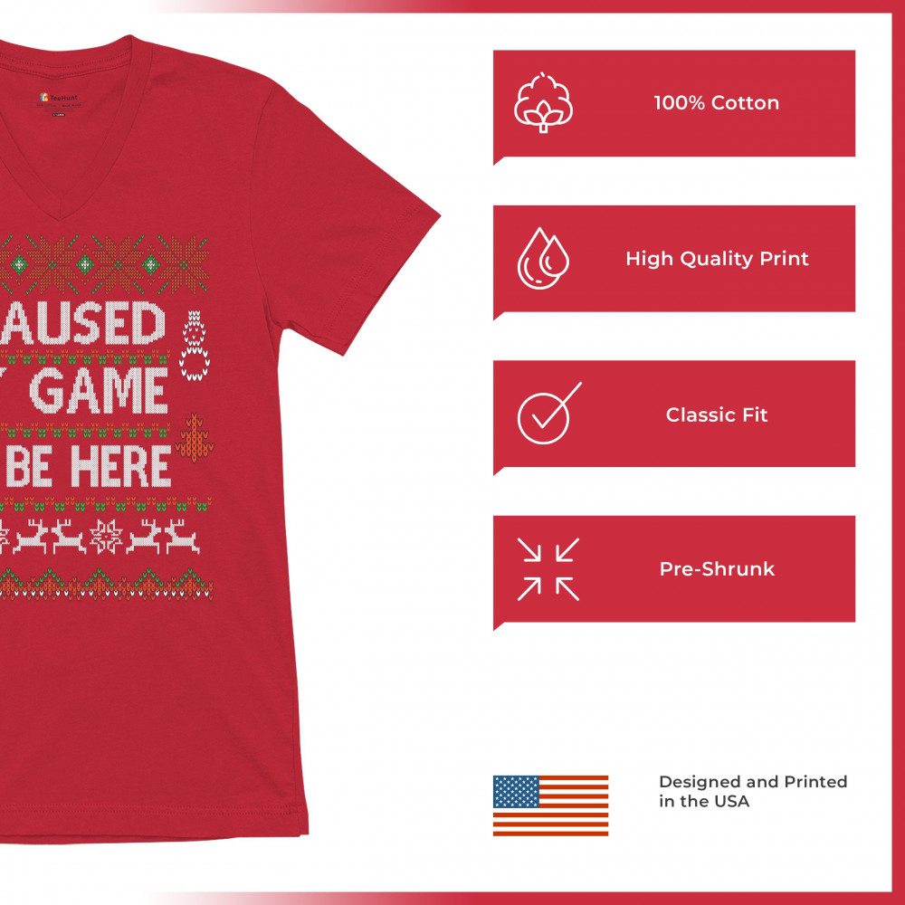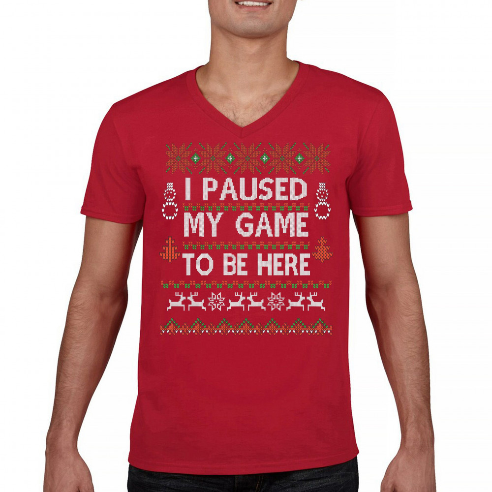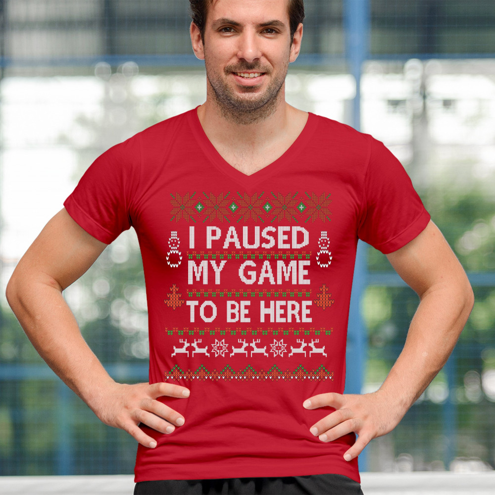 I PAUSED MY GAME TO BE HERE UGLY SWEATER THEME v-neck t-shirt christmas tee red