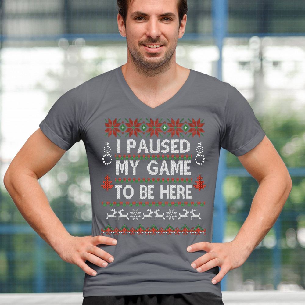 I PAUSED MY GAME TO BE HERE UGLY SWEATER THEME v-neck t-shirt christmas tee charcoal