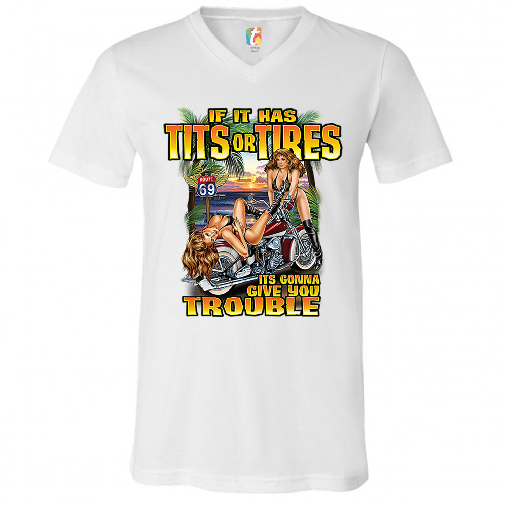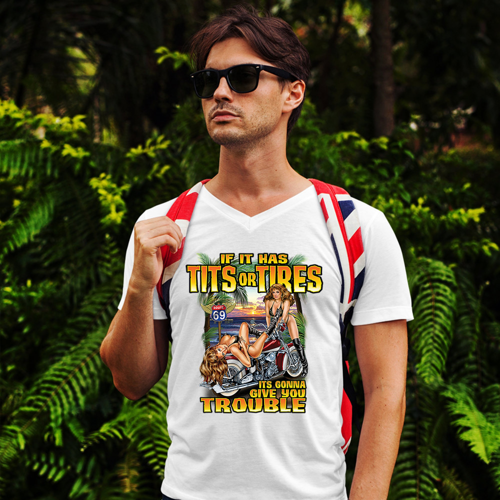A print featuring two barely dressed sexy women leaning on a vintage motorcycle parked at the beach. There is a "Route 69" road sign in the background. The print says: "If it has tits or tires it's gonna give you trouble". A great choice for a motorcycle
