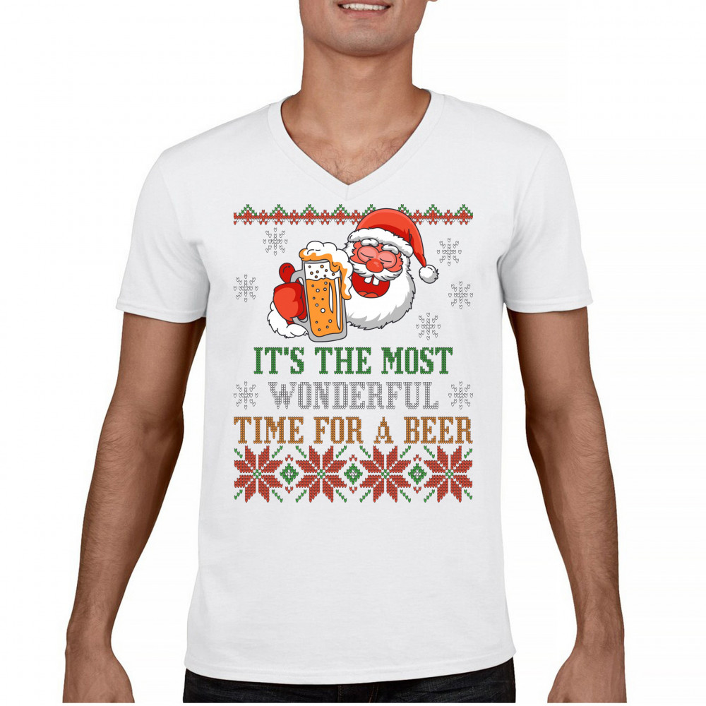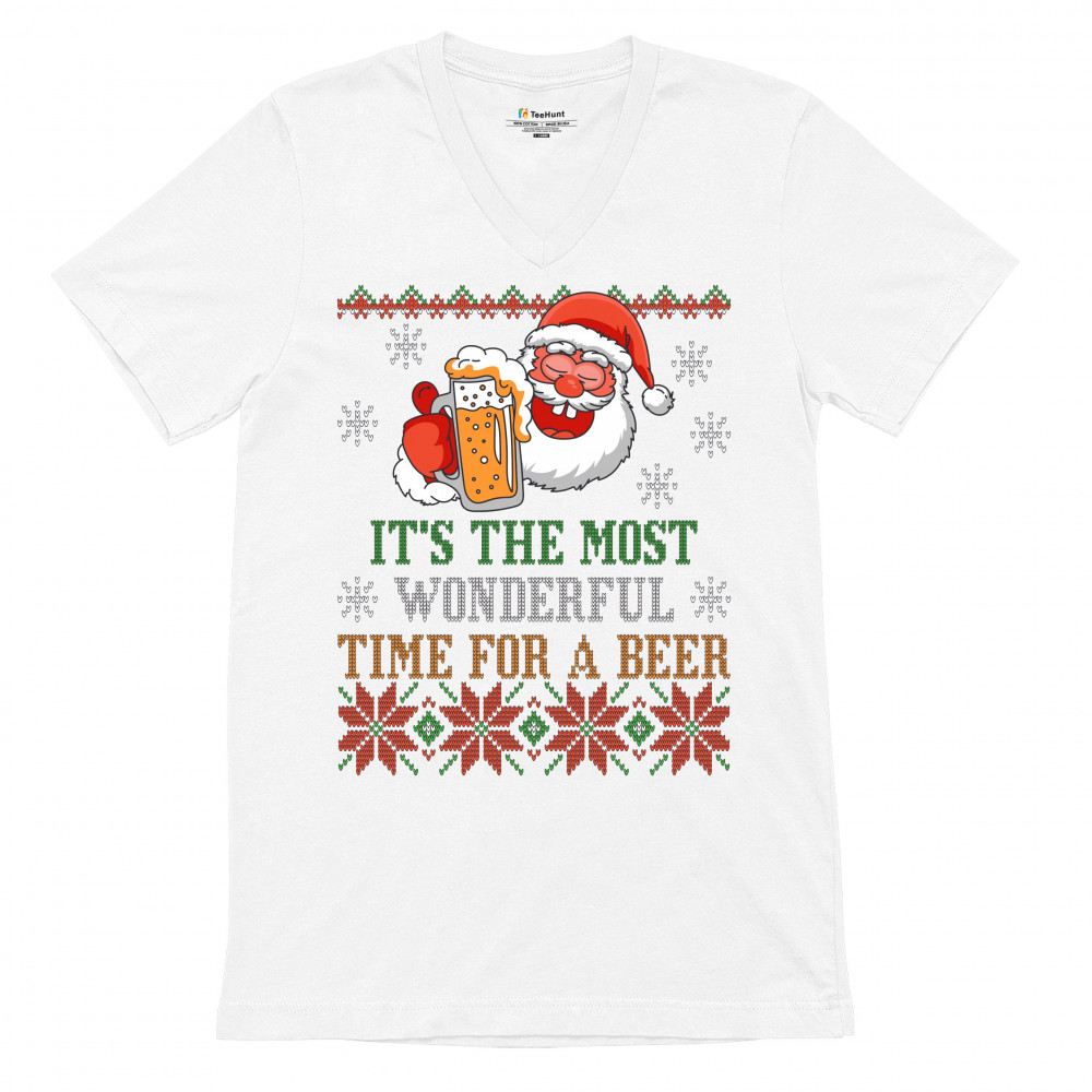 A print saying: "It's the Most Wonderful Time for a Beer" and featuring Santa Claus holding a glass of beer. The print is designed as an ugly sweater. Amazing choice for a single person who wants to make people smile and spread positive vibes on Christmas
