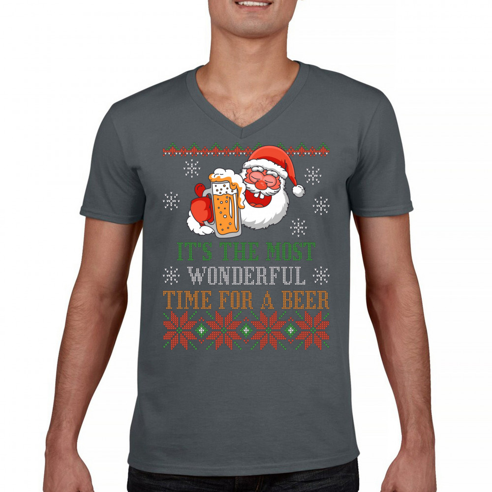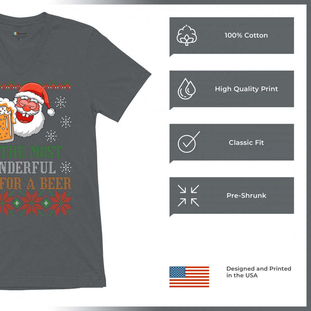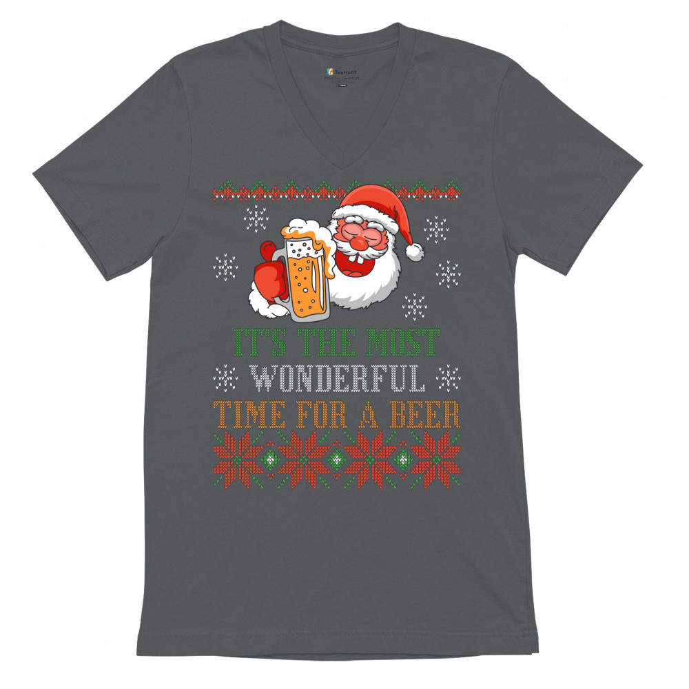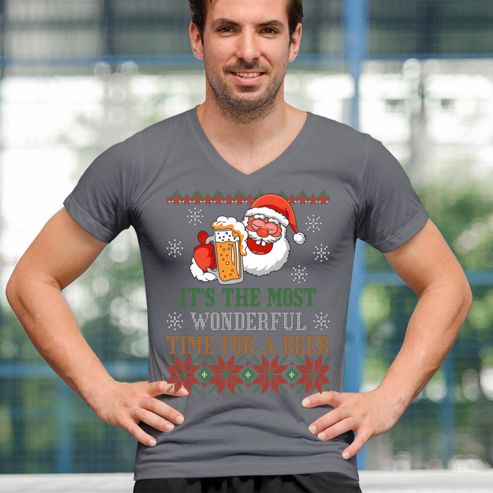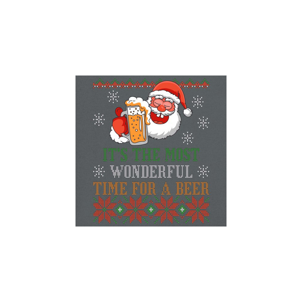 A print saying: "It's the Most Wonderful Time for a Beer" and featuring Santa Claus holding a glass of beer. The print is designed as an ugly sweater. Amazing choice for a single person who wants to make people smile and spread positive vibes on Christmas